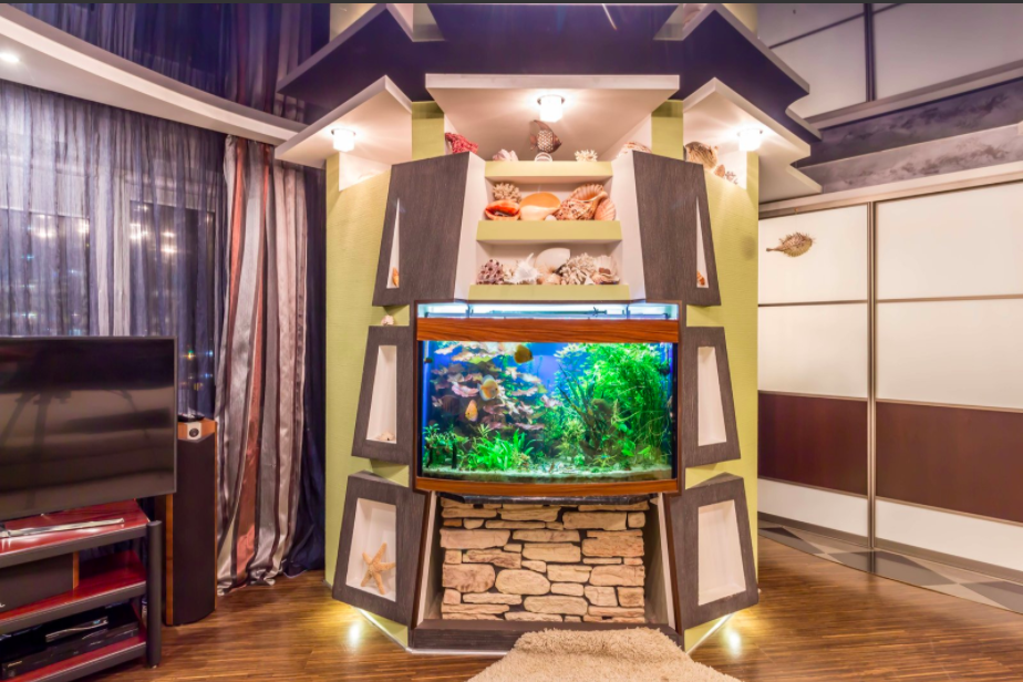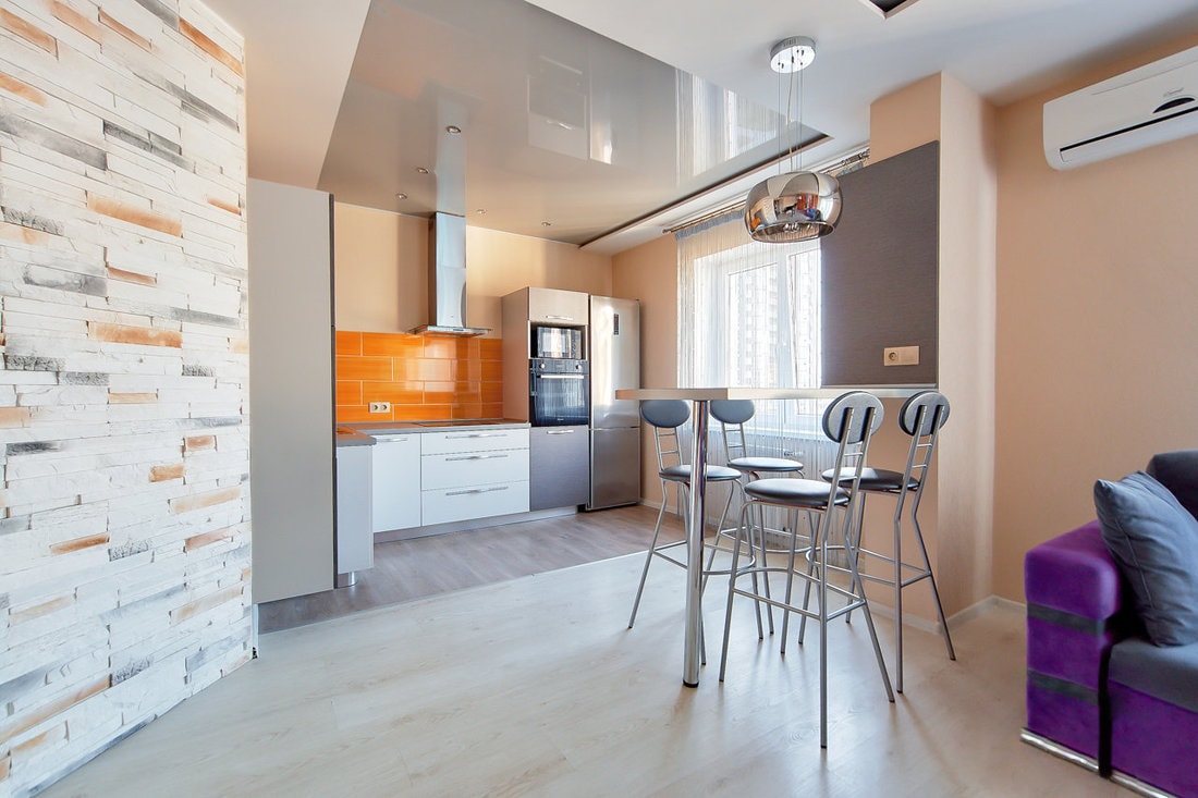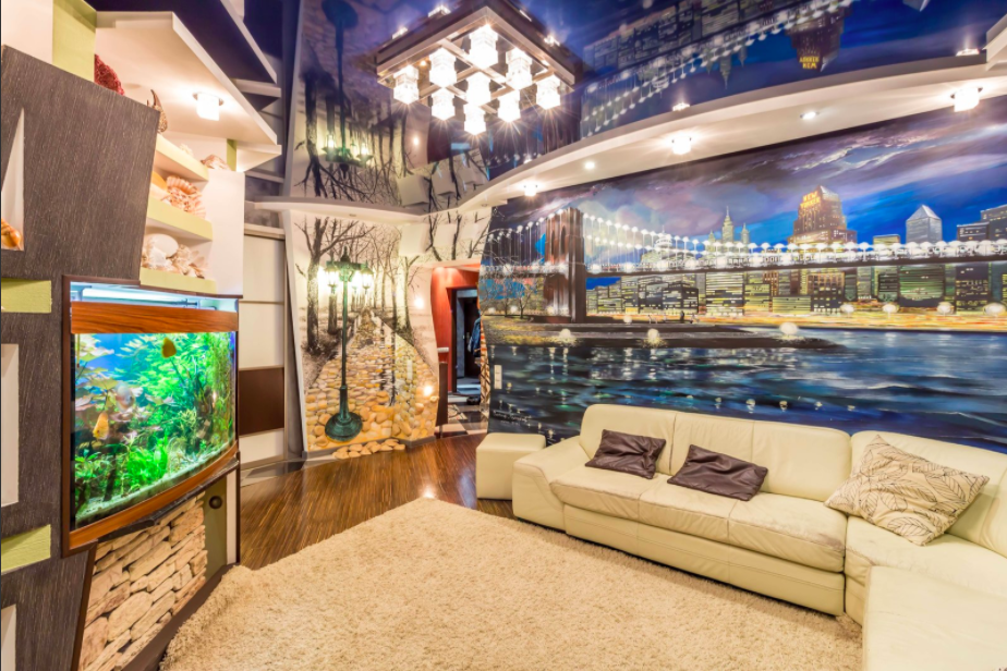 Если верить описанию, перед нами «нетривиальное, яркое, жизнерадостное жилое пространство для молодой энергичной пары». Если продолжать ему верить, то интерьер, в основе которого — городские пейзажи Манхэттена и его окрестностей, несет в себе запах свободы и драйва. Целых 80 кв. м свободы и драйва — казалось бы, что может быть лучше? Разве что наличие 700-литрового аквариума и возможность управлять светом на кухне и в ванной, лежа на диване. Самое то для ленивых.