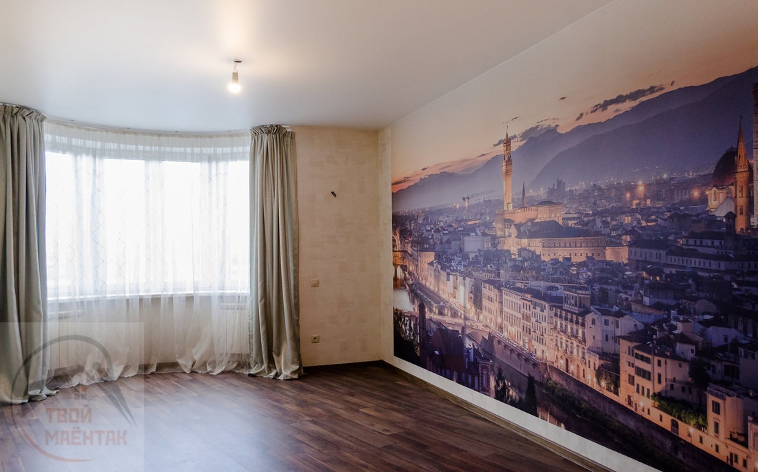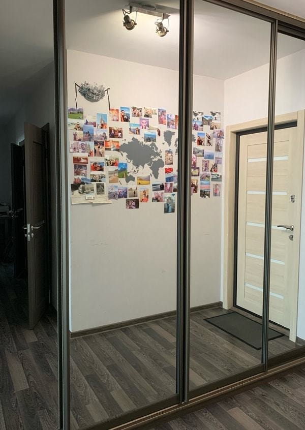 Фотообои фотообоями, а как вам шкаф-купе с видом на неизвестный нам город из прошлого? Заинтересовались? Однушка уже имеет какую-никакую мебель, находится на 8-м этаже дома, окруженного лесом… В общем, платите $43 000 по курсу и заезжайте!