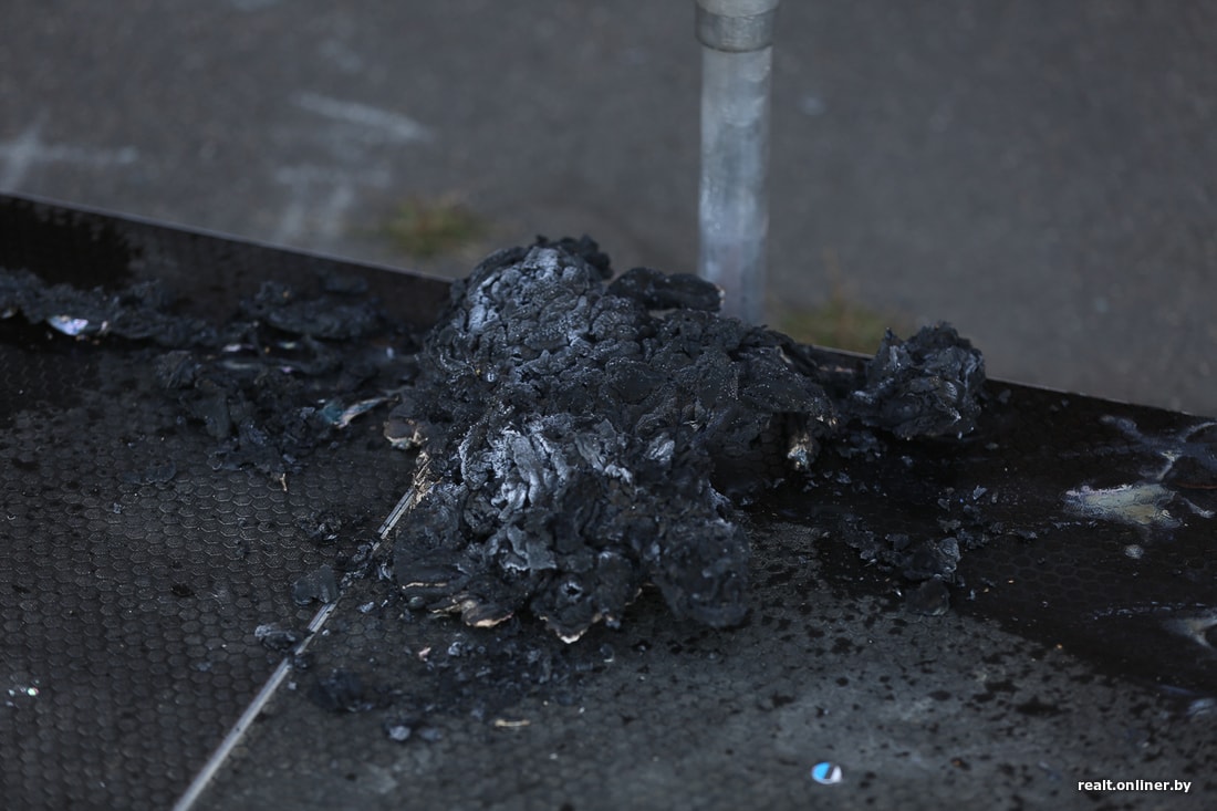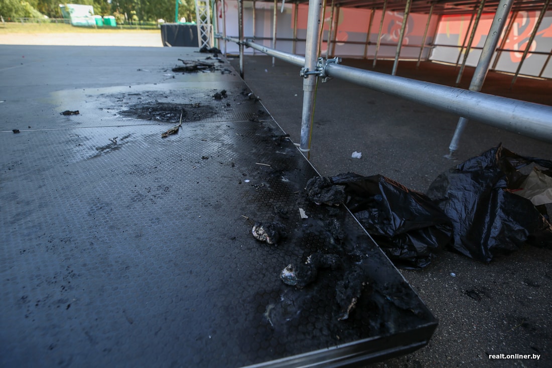 Судя по фото, которое опубликовано в сообществе «Типичный Минск», огнем была повреждена относительно небольшая часть сцены. Как сообщила Onliner официальный представитель МЧС Минска Ольга Мельченко, подразделения МЧС не привлекались, звонков на линию 101 не поступало. Тем не менее сейчас на месте работает милиция, ОМОН, СК и КГБ.