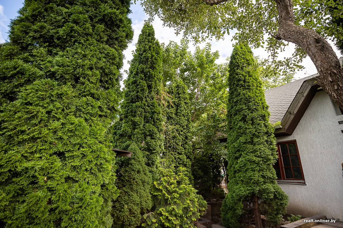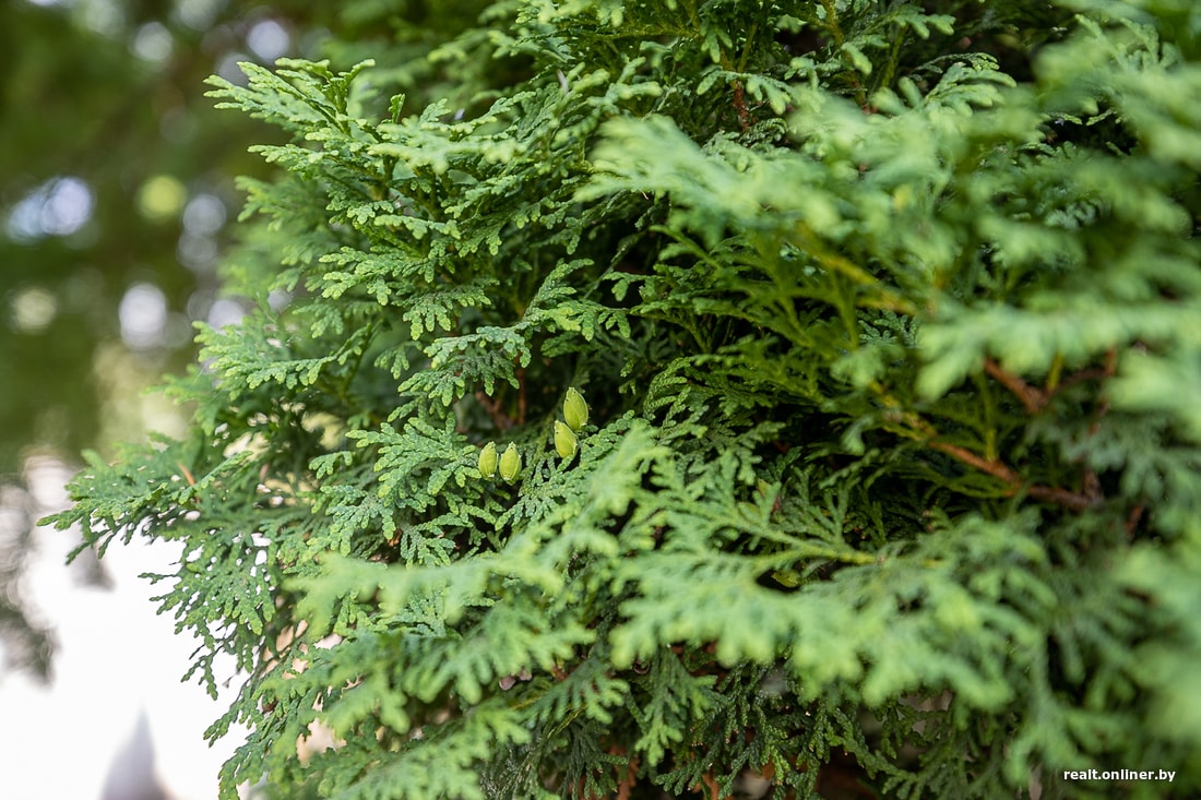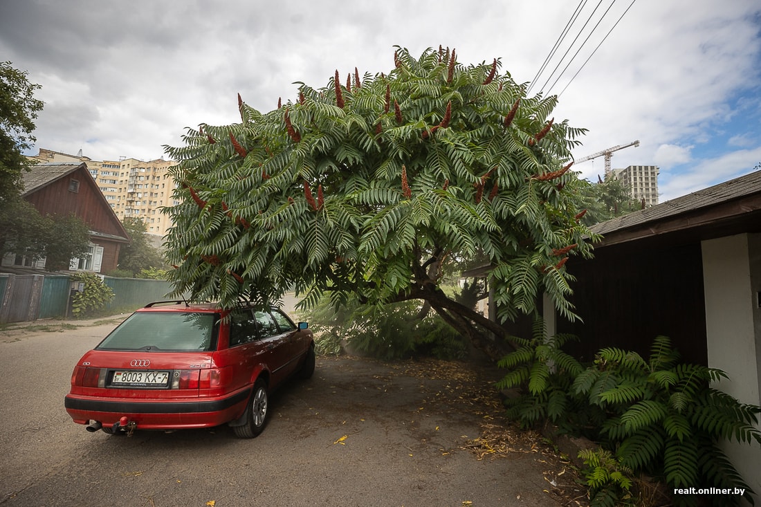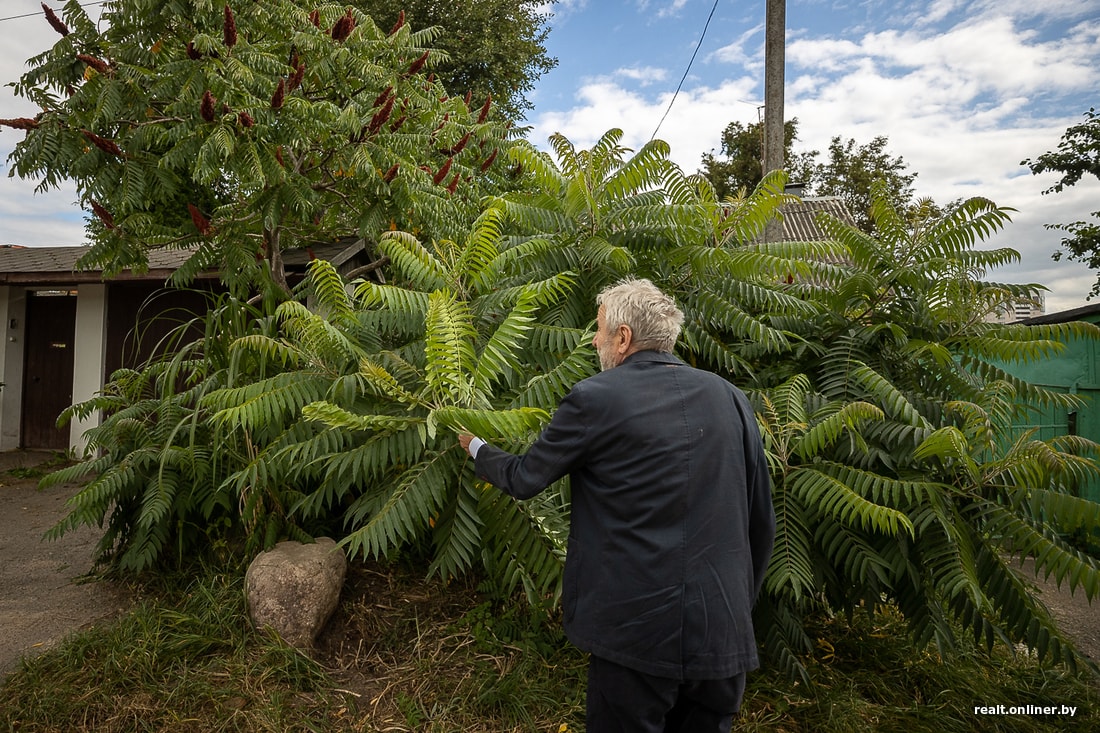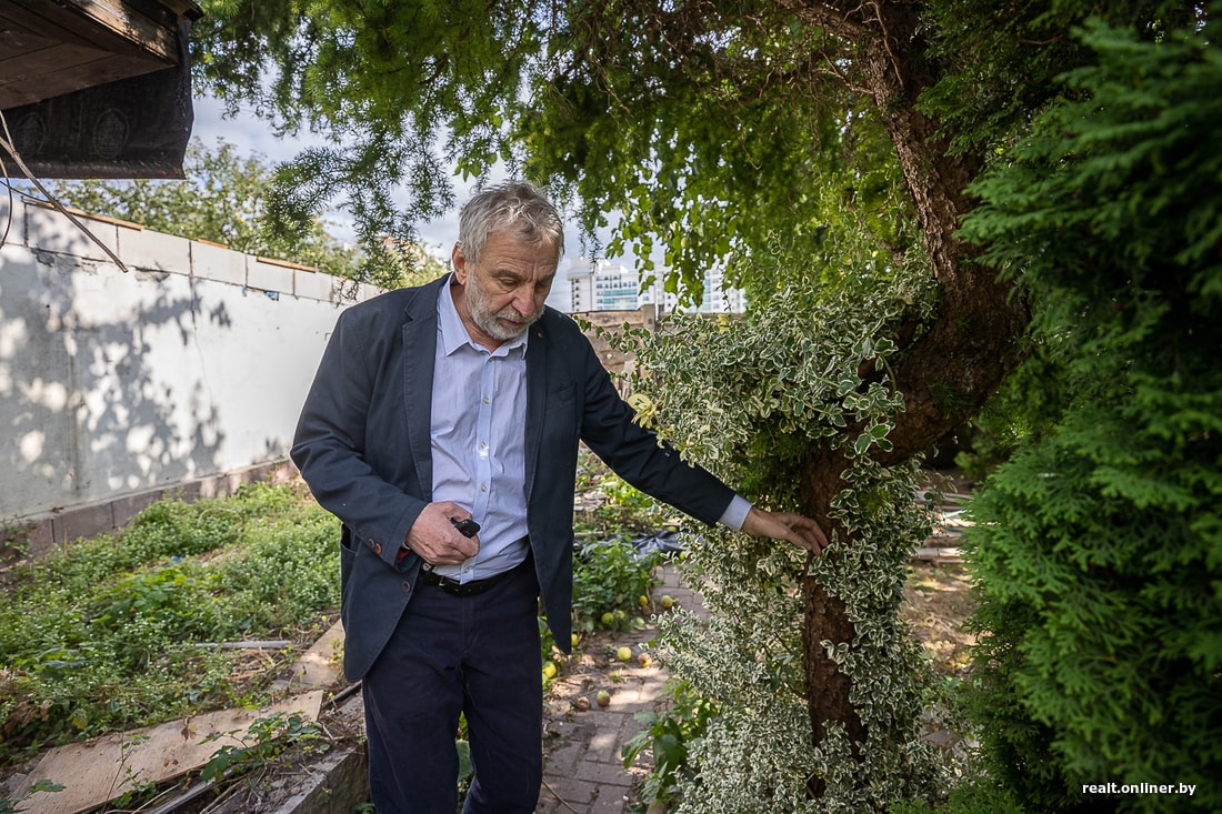 — Вот это — западноевропейская туя, а это — кавказский тис, довольно редкий для Беларуси. Грецкий орех растет, черешня, яблоня еще с 1936 года, я ее лечил постоянно. Японский цитрус, канадская ель, уксусное дерево… Я саженцы со всего мира привозил: из Польши, Германии, Нидерландов, Греции, США… Почему бы не оставить все эти деревья тем, кто будет здесь жить? Но это никому не нужно, нужно лишь выжать максимум долларов из каждого квадратного метра. Растения просто пустят под пилу и на их месте посадят в рядок липки.