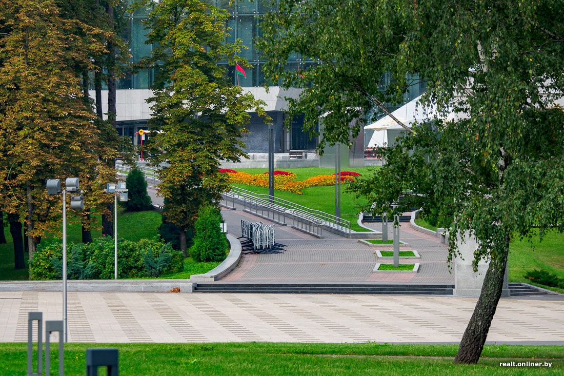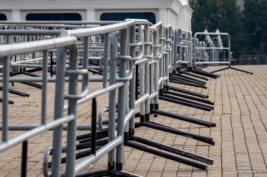 Ну и металлические заграждения пока не стали никуда увозить: стоят перед Дворцом республики и новым музеем Великой Отечественной войны, будто на выставке.