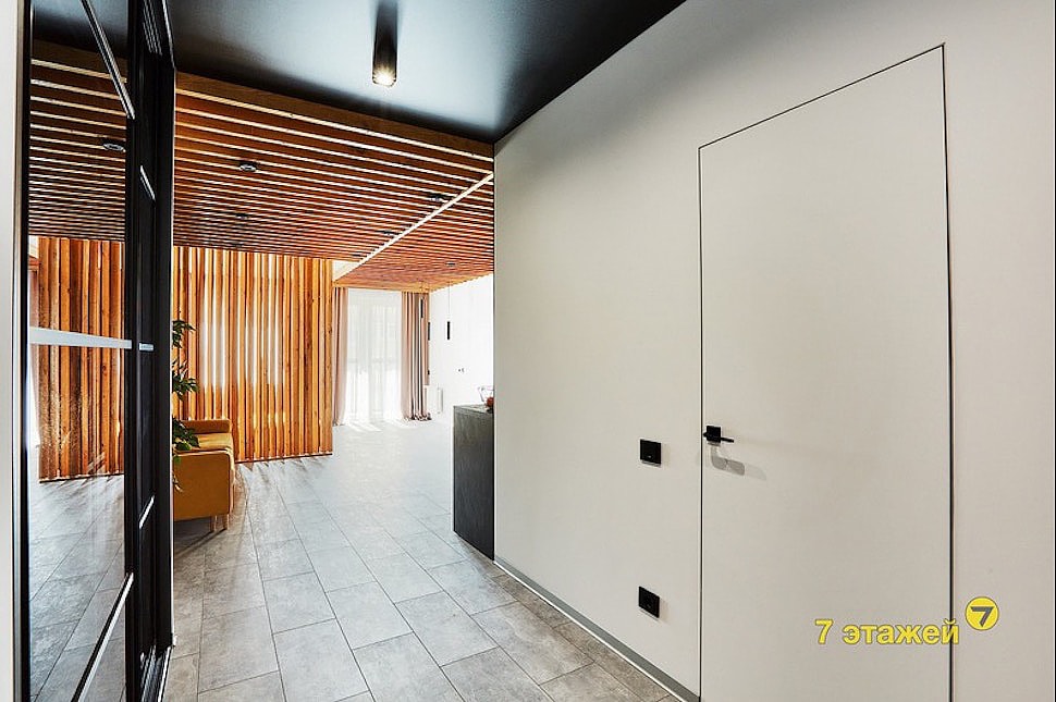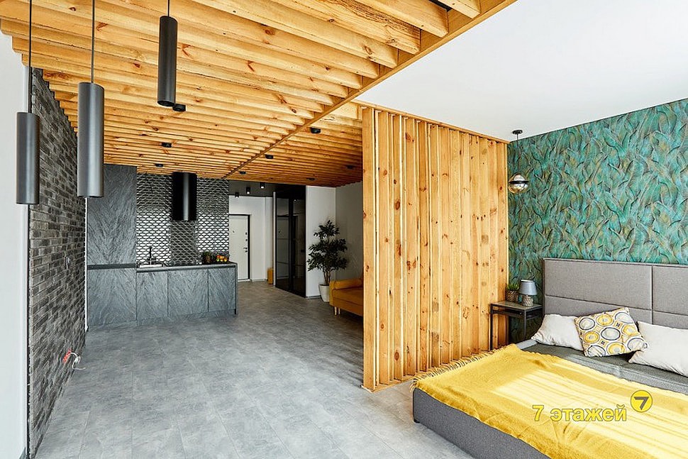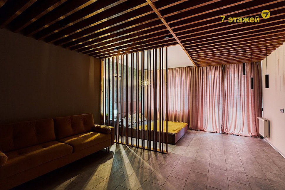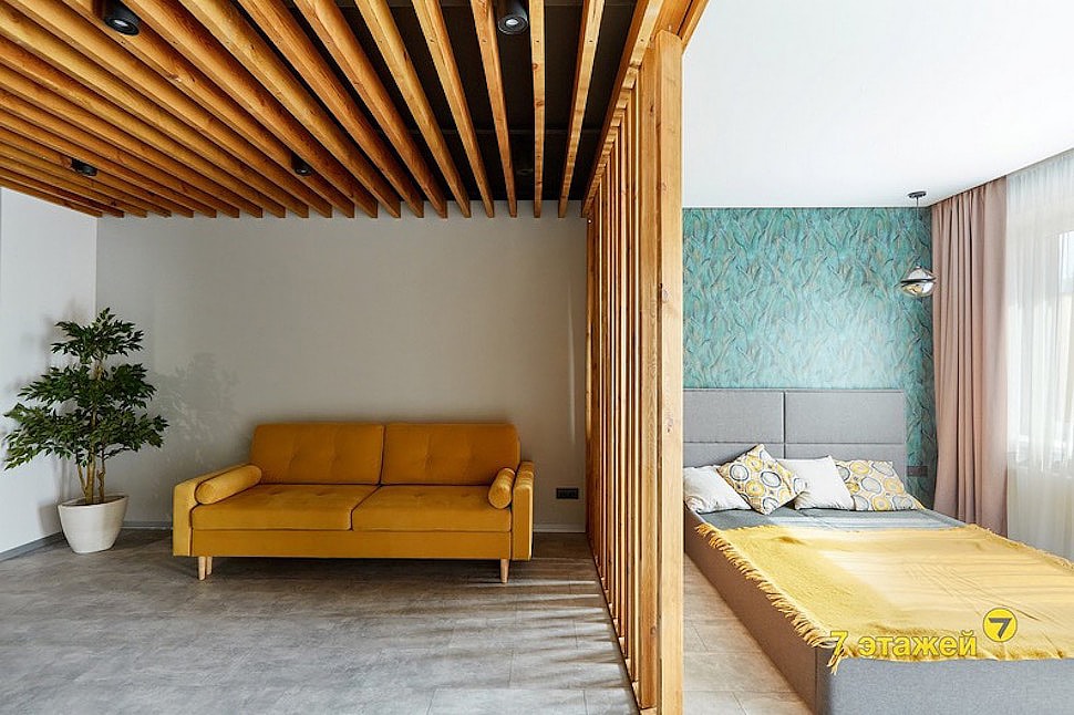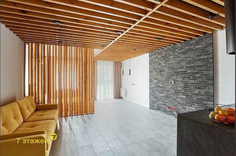 В жилой части серо-белая картина дополняется активным цветом теплого дерева. Причем многочисленные рейки не только делят помещение на спальную и гостиную зону, но и украшают потолок. Такое редко встретишь в минских квартирах — отчасти из-за того, что белый ровный потолок это беспроигрышный вариант, отчасти из-за того, что потолки в большинстве домов невысокие, какие-нибудь 2,70 метра, куда тут уменьшать?