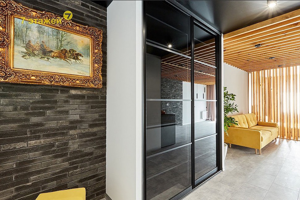 В оформлении интерьера этой квартиры активно используется контраст цветов: белые стены прихожей «спорят» с графитовым потолком и темной стеной из «кирпичика». Лаконичные черные светильники дополняют картину. Однако ощущение минимализма разбавляет классическая картина русской зимы в массивной золотой раме. Возможно, ей отводится роль вау-эффекта: взгляд точно цепляет.