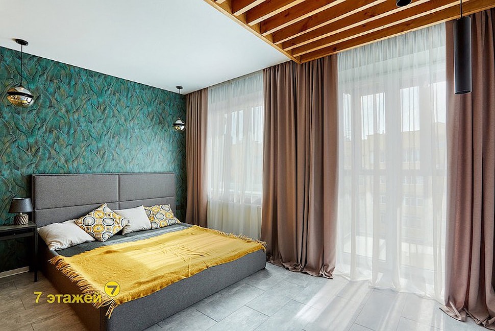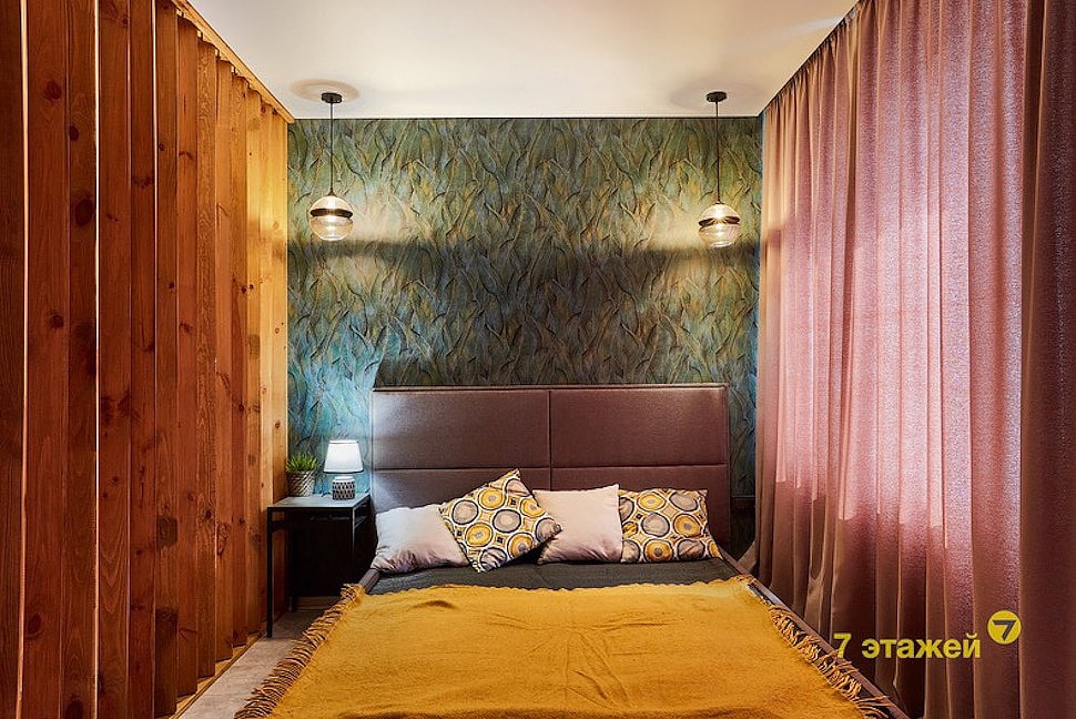В спальной зоне дизайнер с хозяином ввели новый цвет — назовем его цвет морской волны. Текстиль для окон выбрали пыльно-розовый. Смотрится гармонично и уютно.