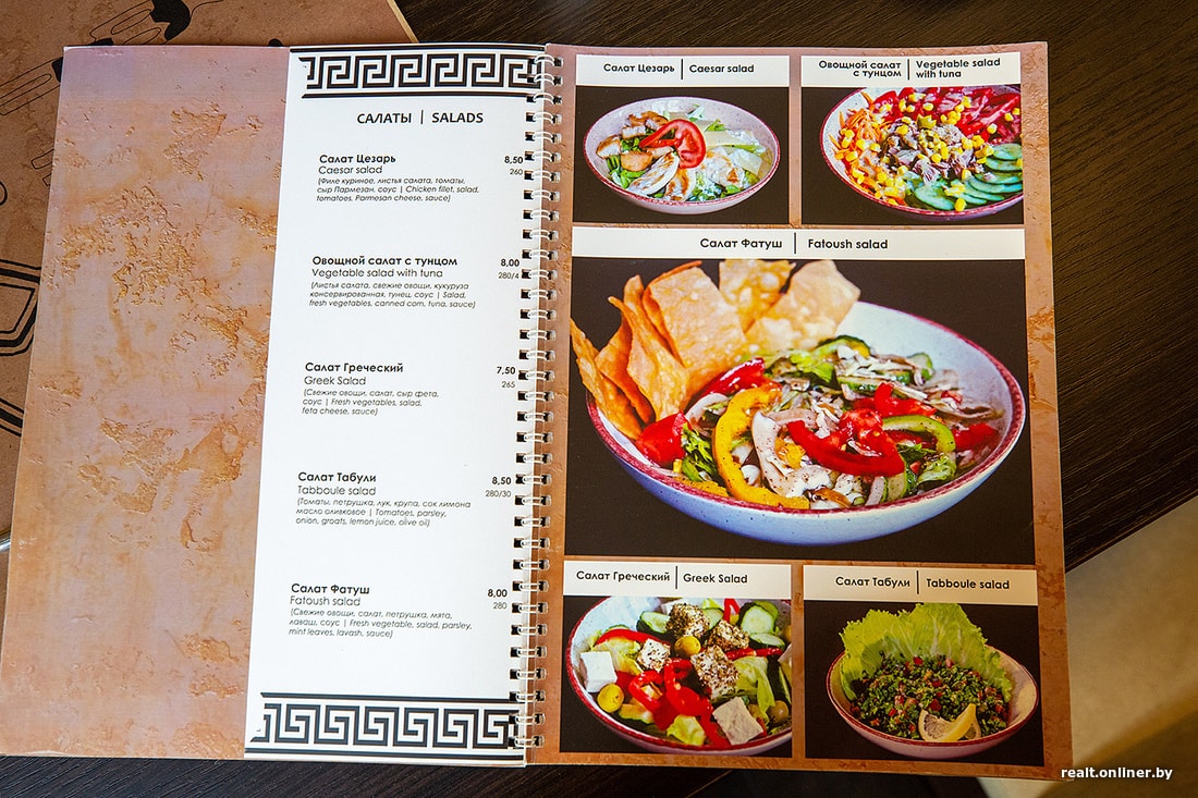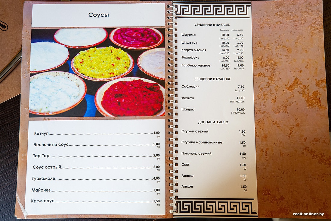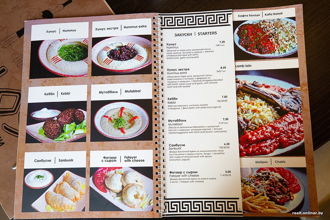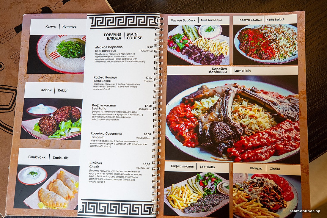 Основа меню — ливанские блюда, которые ранее готовились на Интернациональной. Что-то переделалось на современный лад, что-то добавилось. Марун утверждает, что цены невысокие, учитывая размеры блюд, и поднимать их в ближайшее время не планируется. В целом цены средние.