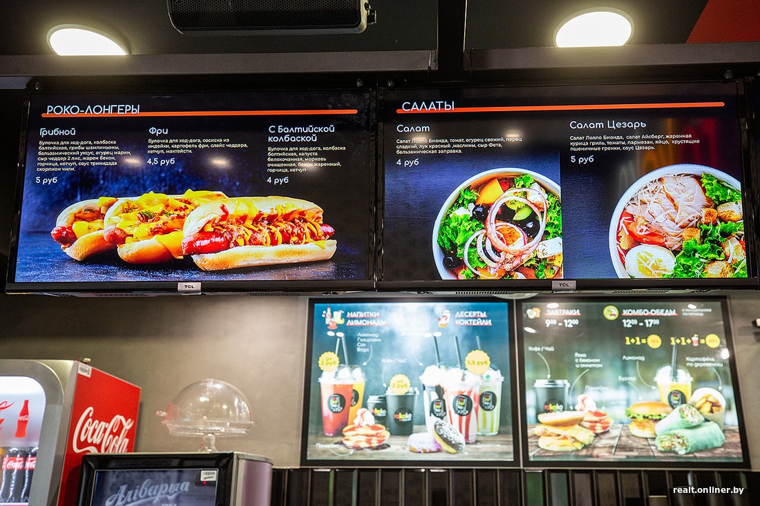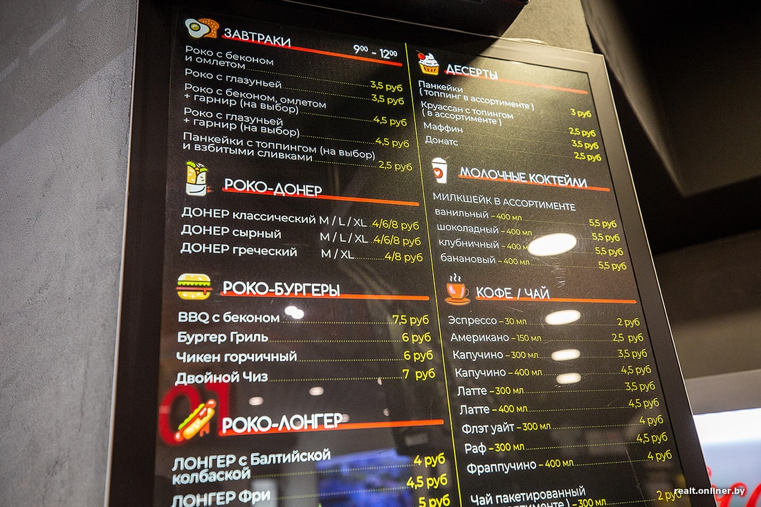 В меню собрали весь фастфуд как он есть: пиццы, донеры, хот-доги, бургеры, картошечки, десерты. Целью было объединить «МакДональдс», KFC, Burger King, пиццерии и шаурменные, но так, чтобы отличаться от них своими фишечками. Фишечкой стали лонгеры, большая шаурма в зеленом лаваше, завтраки и пиво.