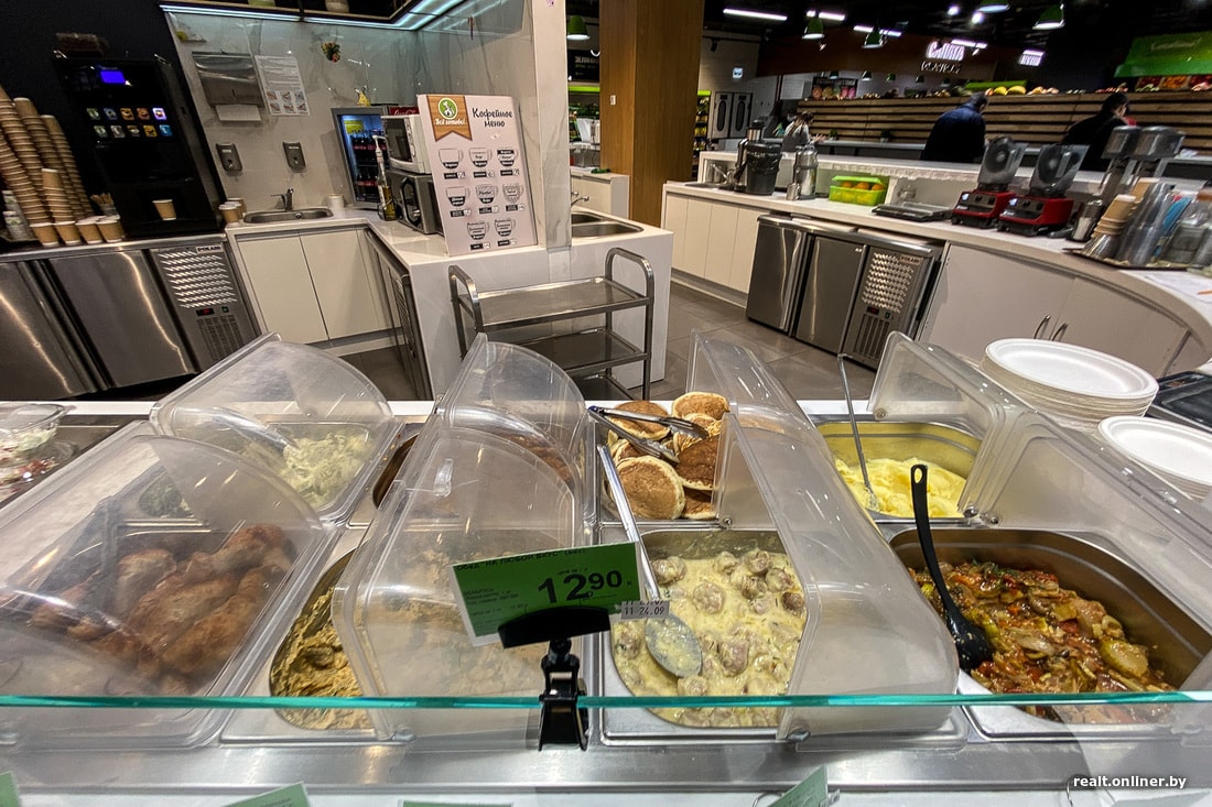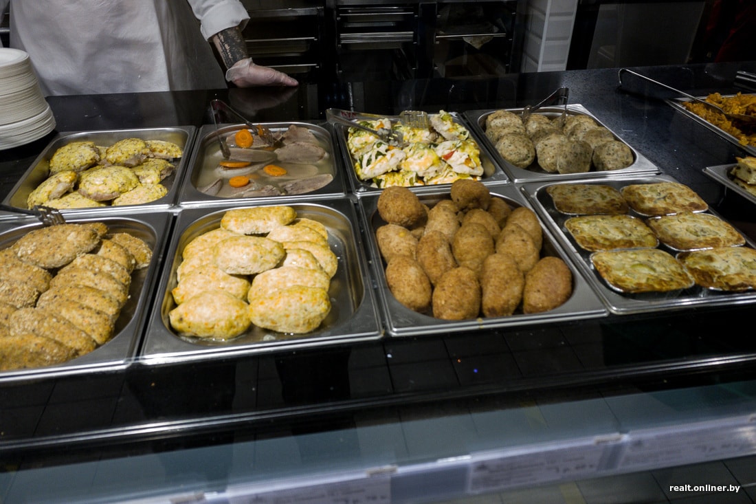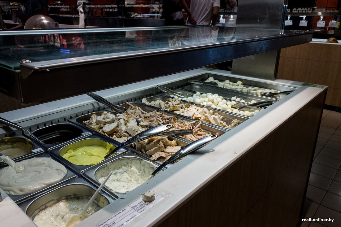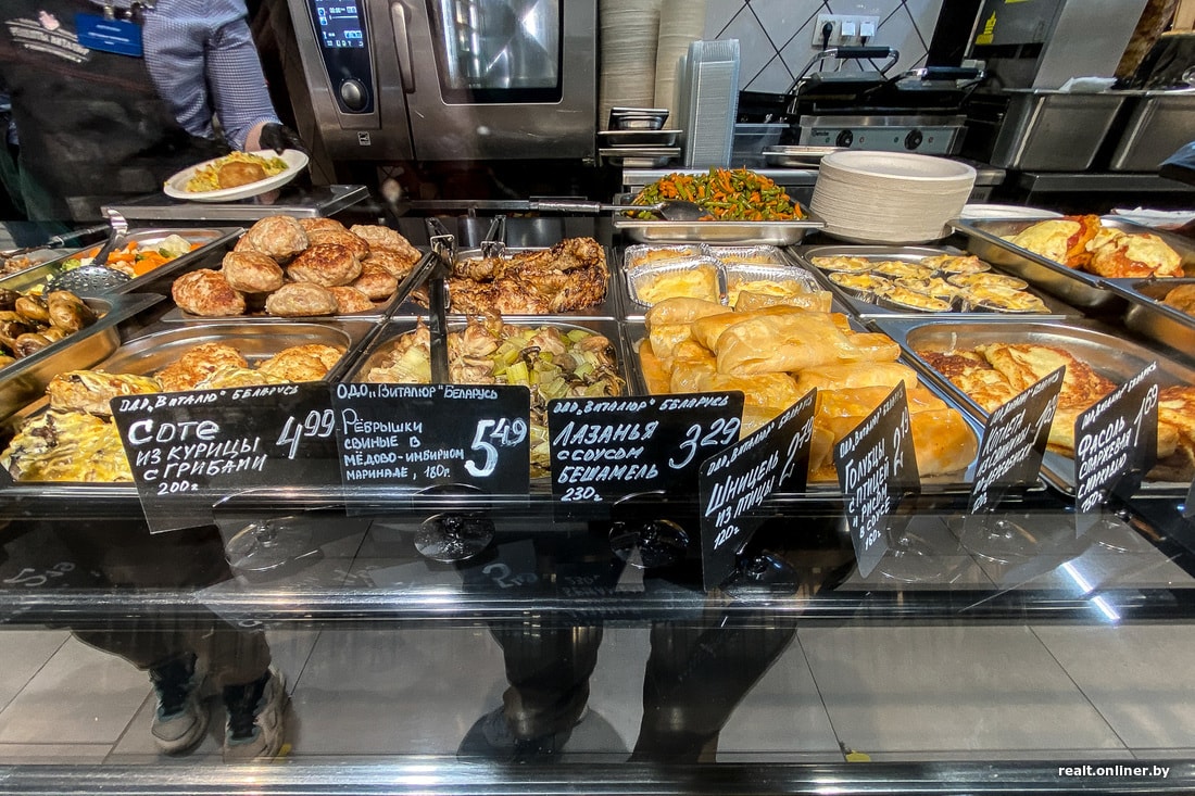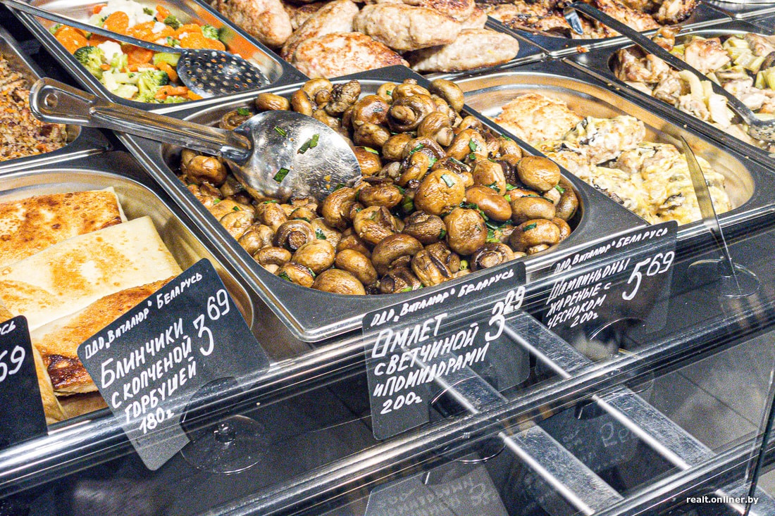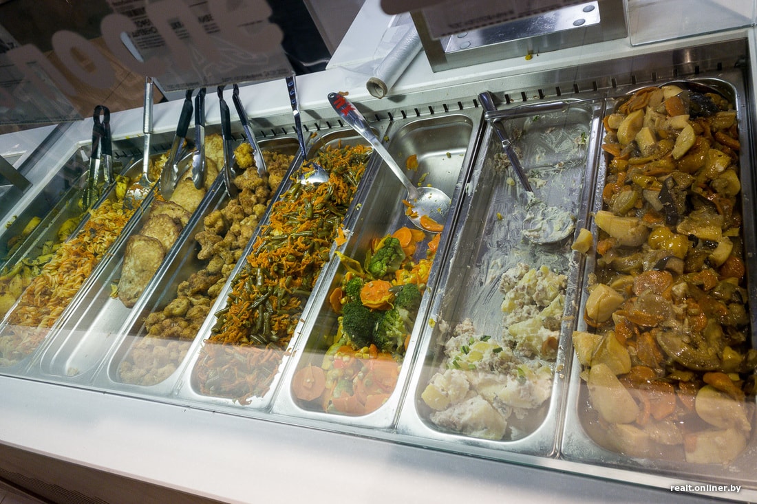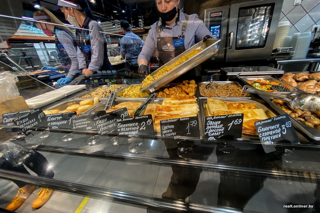 В Galleria Minsk ввели довольно интересный подход к ценообразованию основных блюд. Чтобы клиенты не мучились подсчетами, а продавцы — размещением ценников, все вторые блюда продаются по фиксированной цене — 12,9 р. за кило. Берем то, что нравится, и платим за вес — вот и вся премудрость.