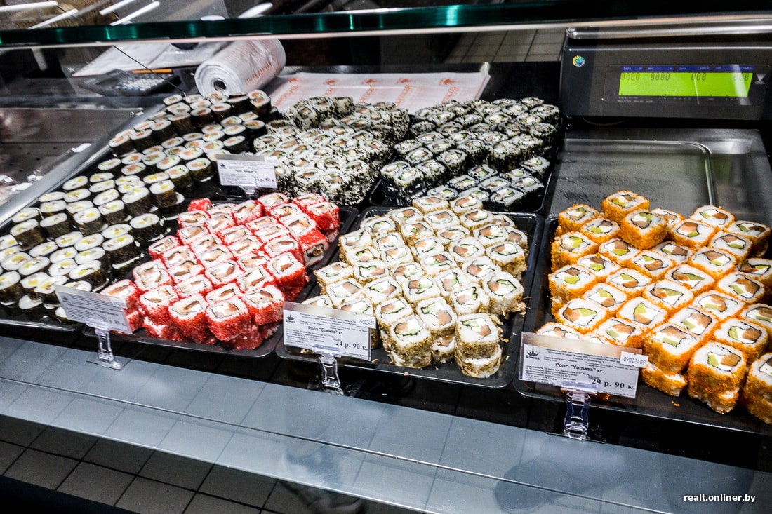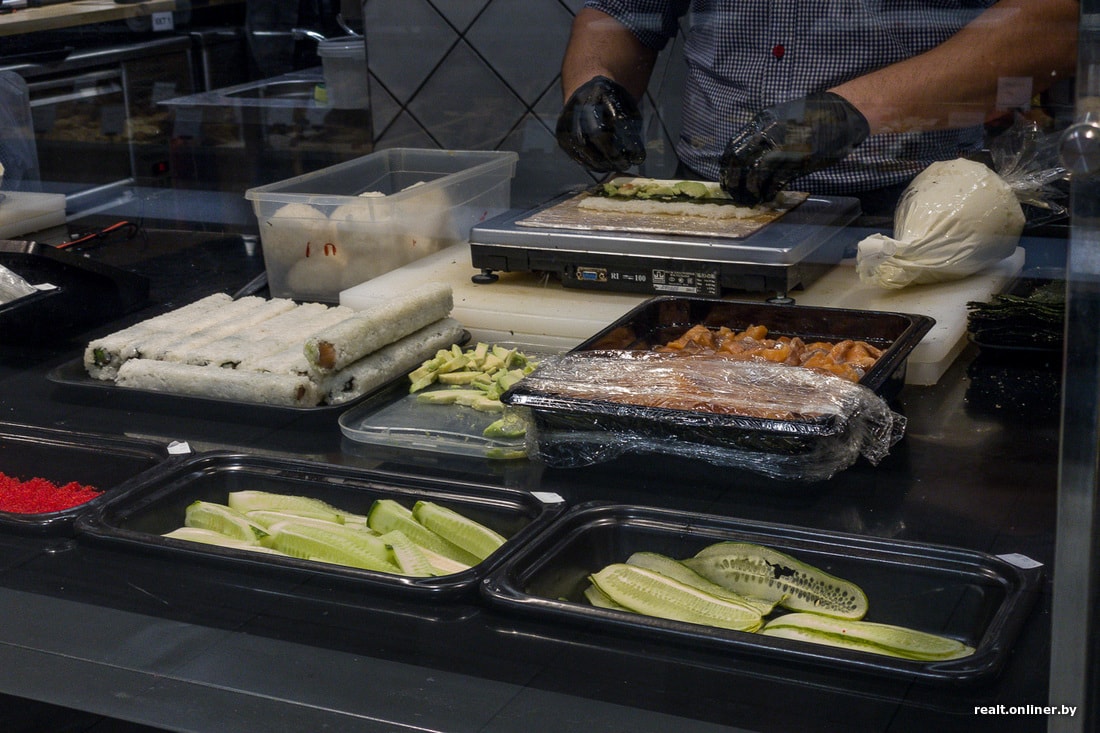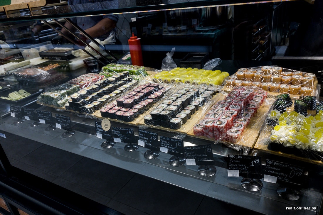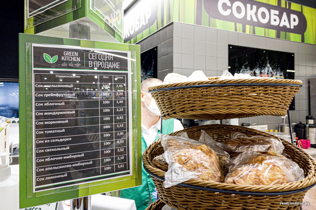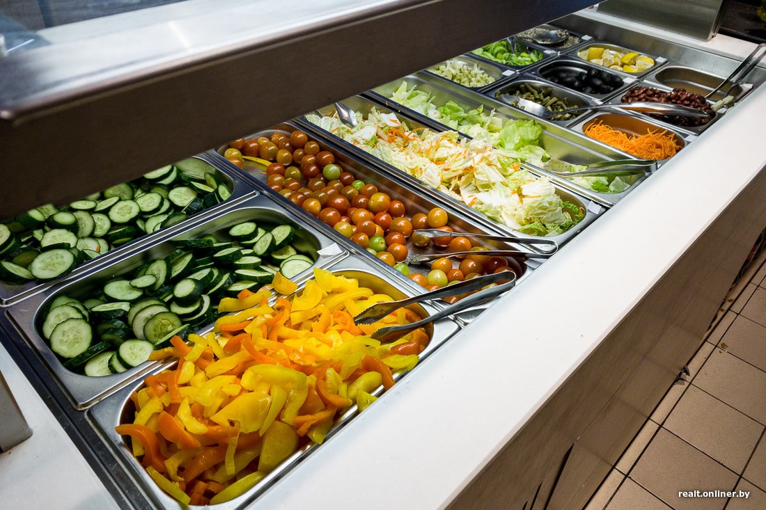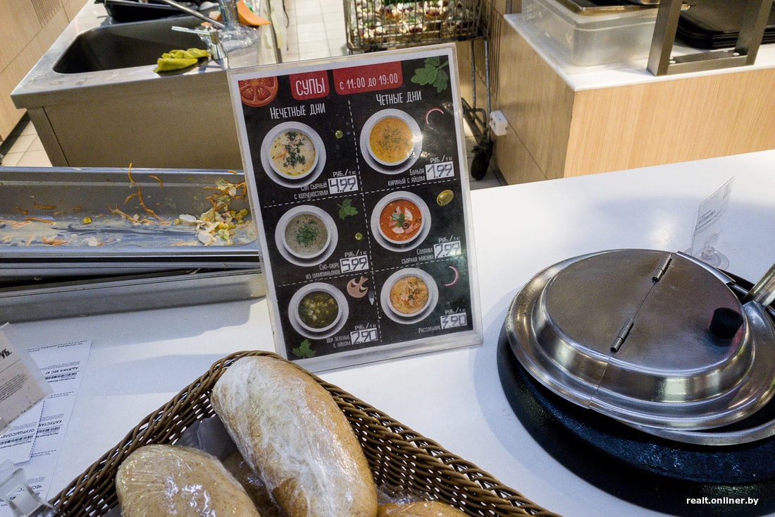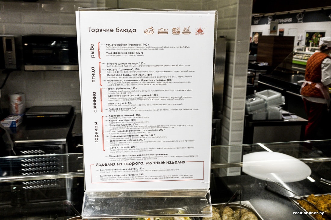 В Galleria Minsk ввели довольно интересный подход к ценообразованию основных блюд. Чтобы клиенты не мучились подсчетами, а продавцы — размещением ценников, все вторые блюда продаются по фиксированной цене — 12,9 р. за кило. Берем то, что нравится, и платим за вес — вот и вся премудрость.