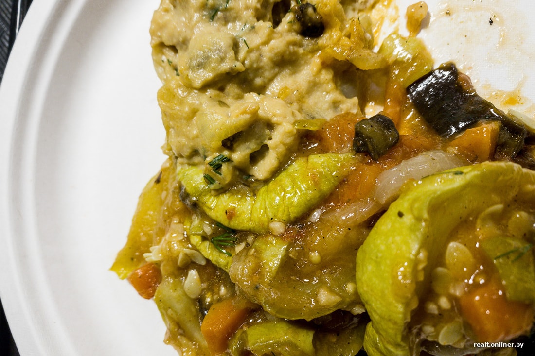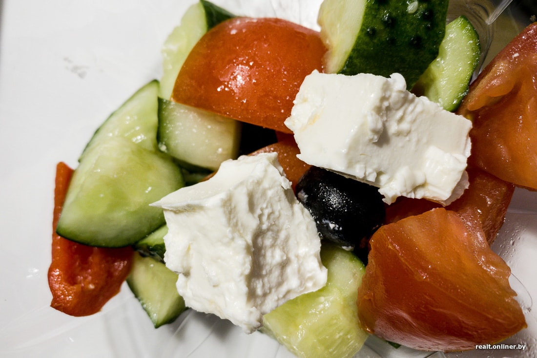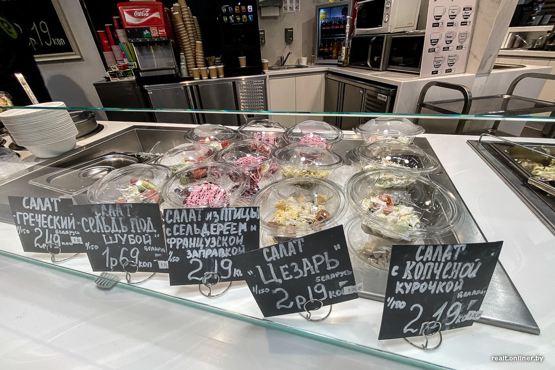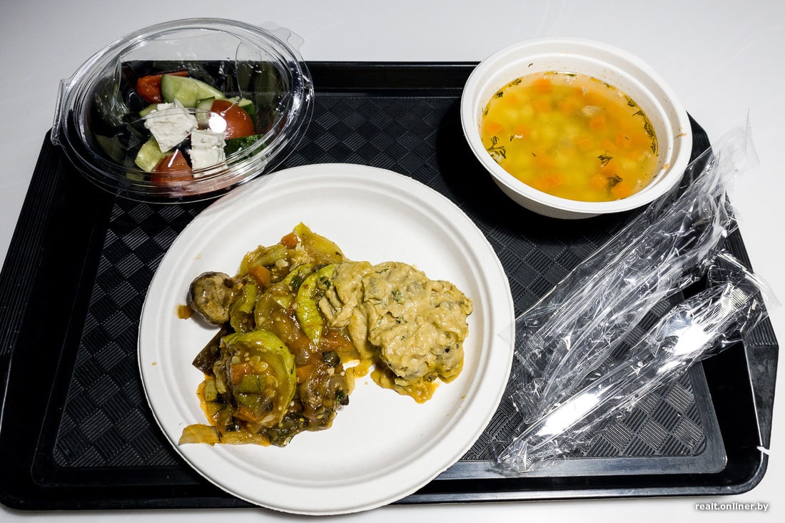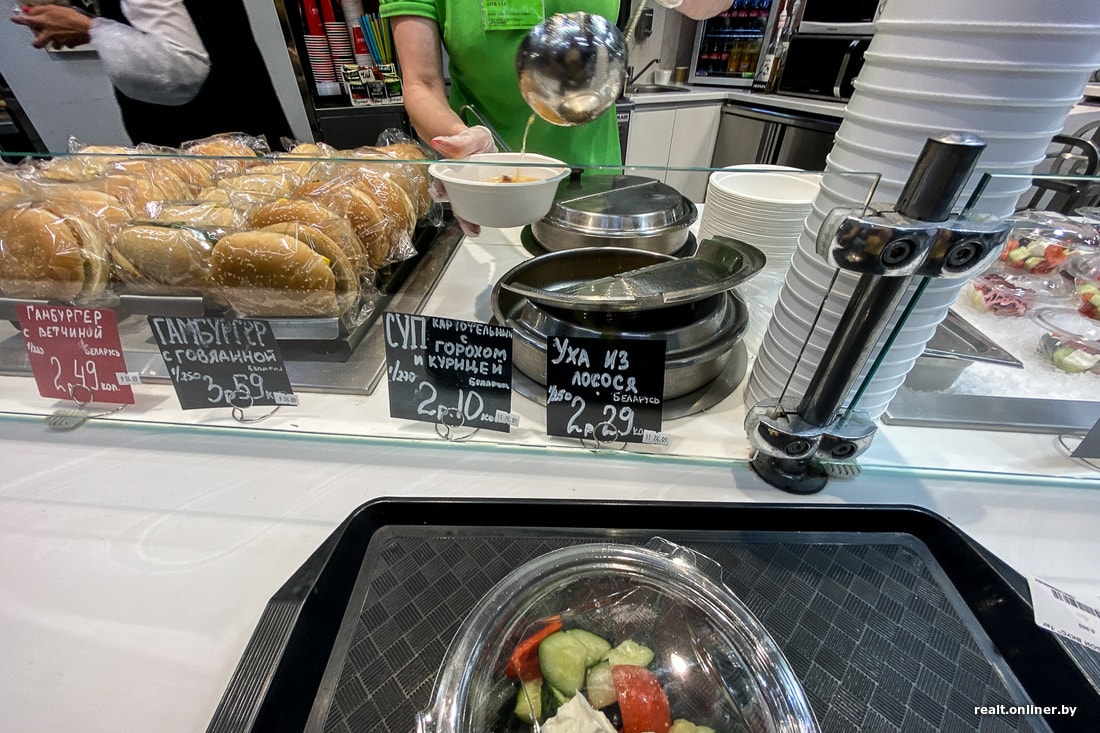 Хороша была только уха. Второе блюдо из овощей и печени визуально походило на пюре. Печени как таковой было не много, зато лука и соуса — хоть отбавляй. Греческий салат утратил свежесть и тоже не порадовал. В общем, качество и ассортимент еды на фуд-корте «Евроопта» несколько не дотягивает до уровня цен.