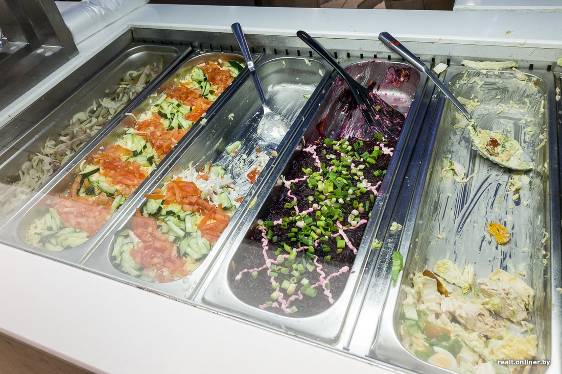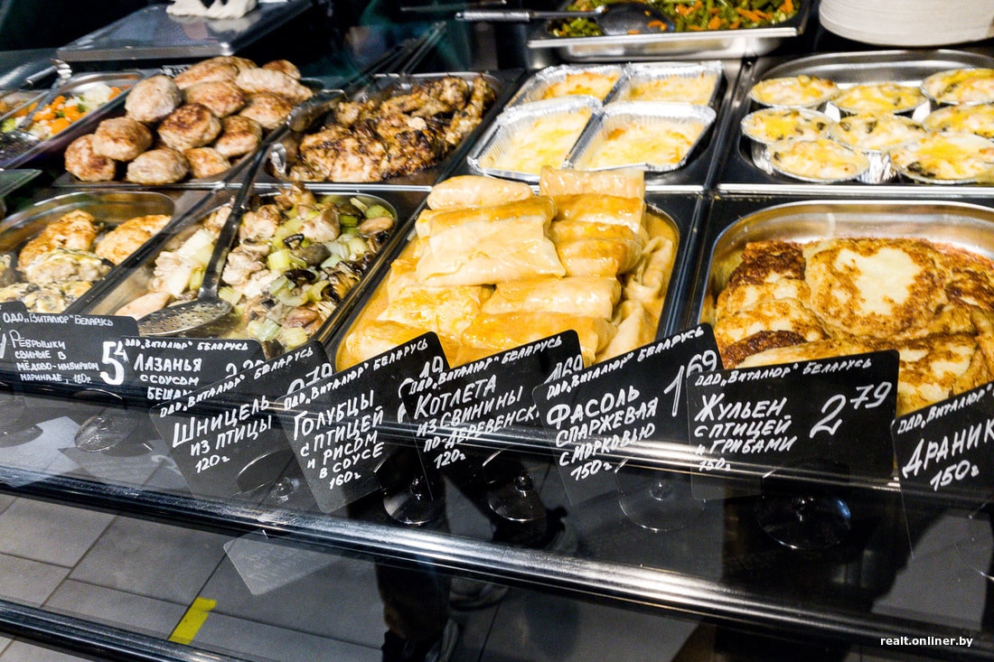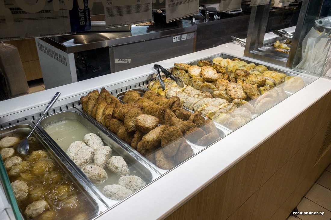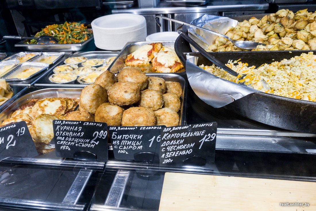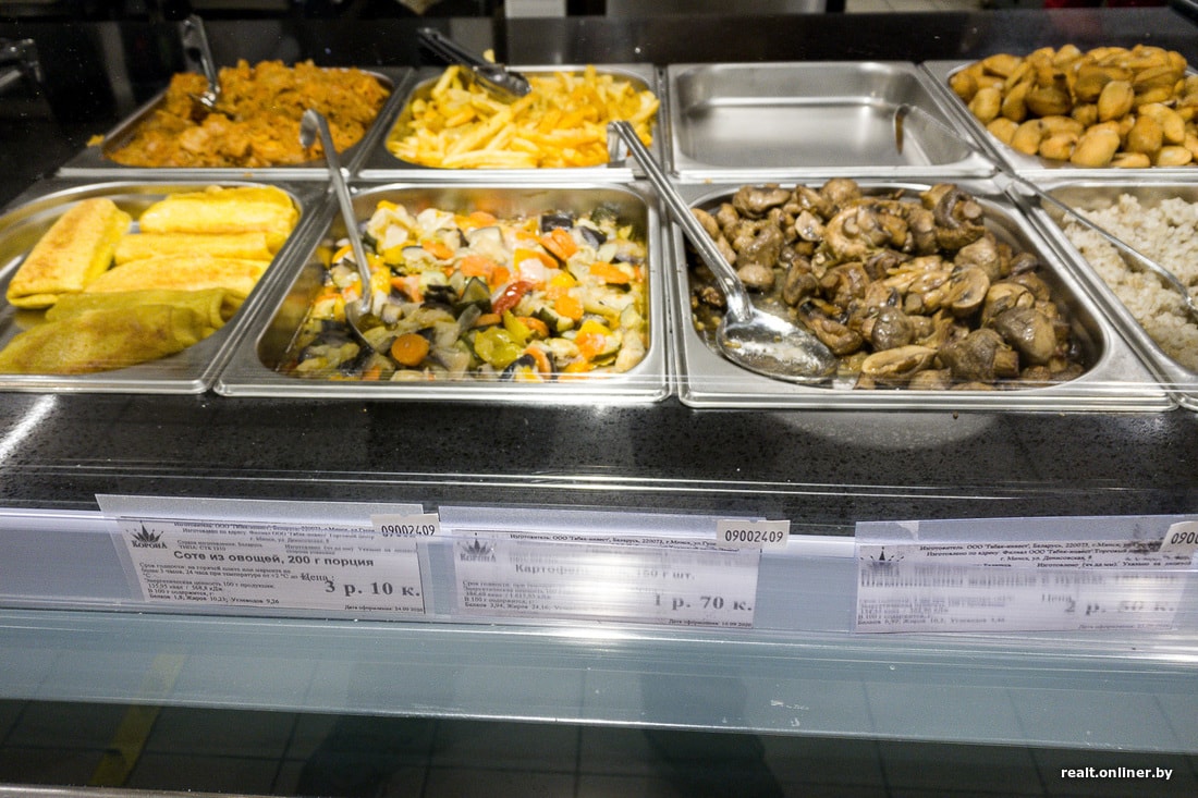 Как и в «Евроопте», в «Алми» все вторые блюда продаются на развес по фиксированной цене — 11,9 р. за 1 кг. Есть три вида супа по цене от 1,5 р. Салат-бар тоже недешев: 1,49 р. за 100 г. В общем, огромный ассортимент, высокие цены, среднее качество.