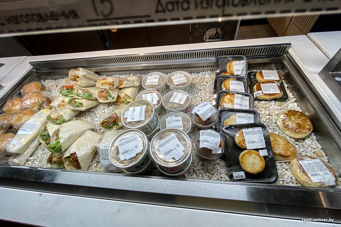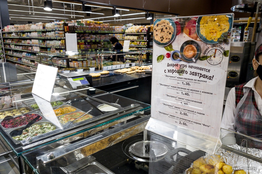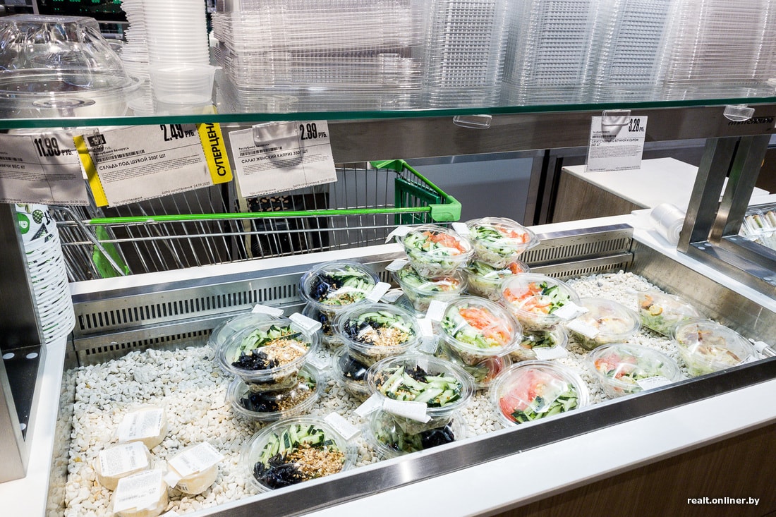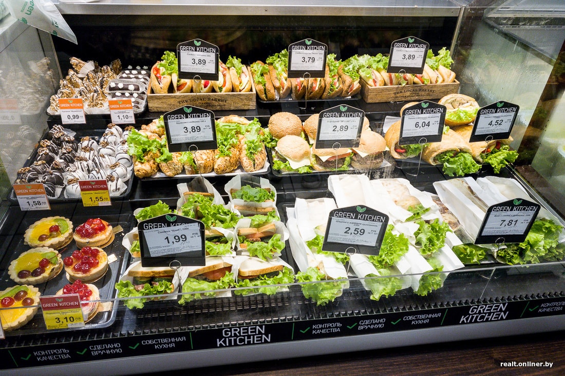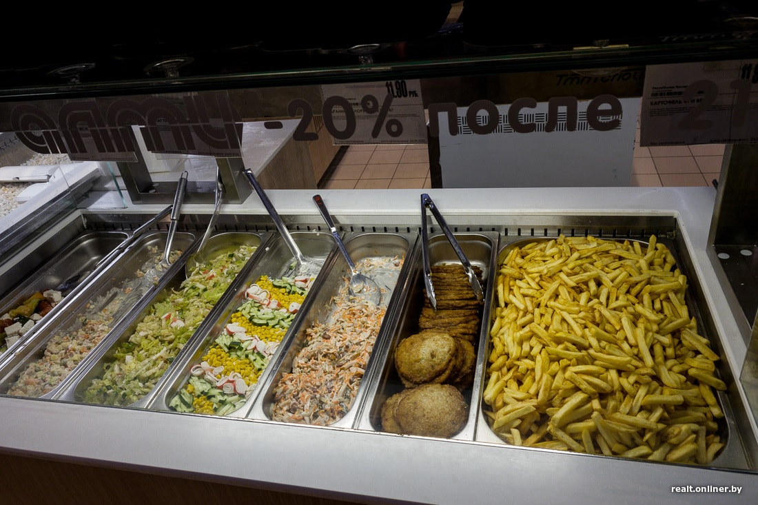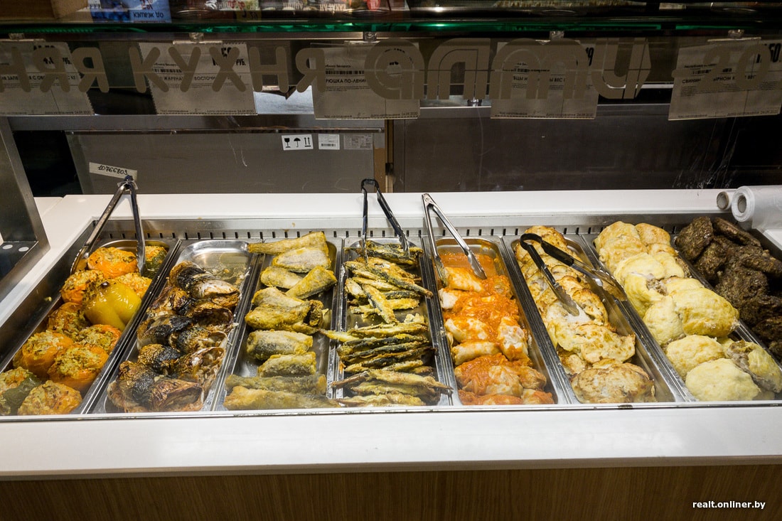 Как и в «Евроопте», в «Алми» все вторые блюда продаются на развес по фиксированной цене — 11,9 р. за 1 кг. Есть три вида супа по цене от 1,5 р. Салат-бар тоже недешев: 1,49 р. за 100 г. В общем, огромный ассортимент, высокие цены, среднее качество.
