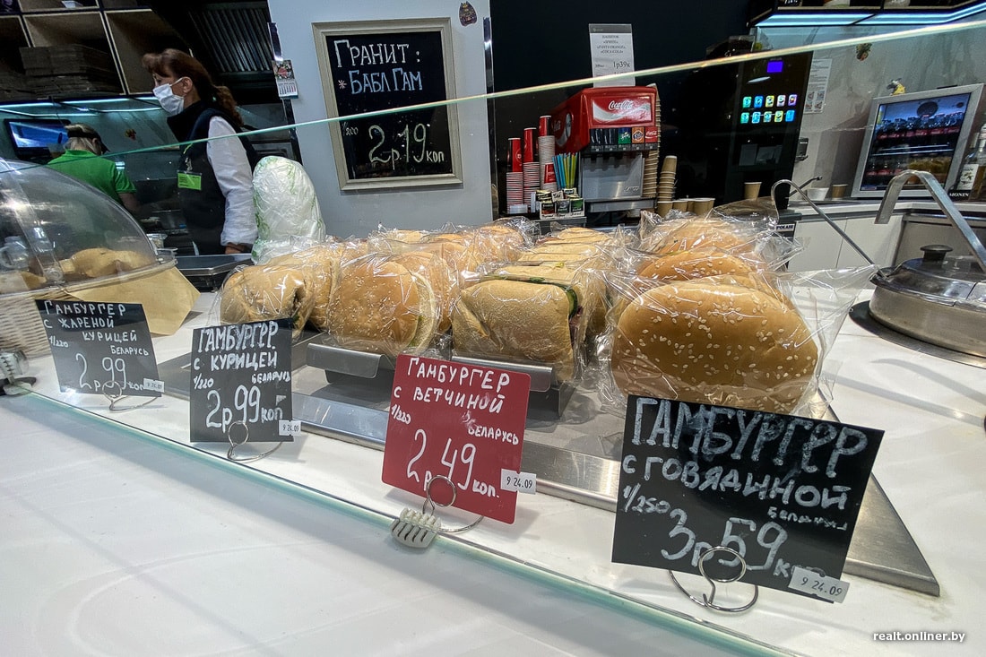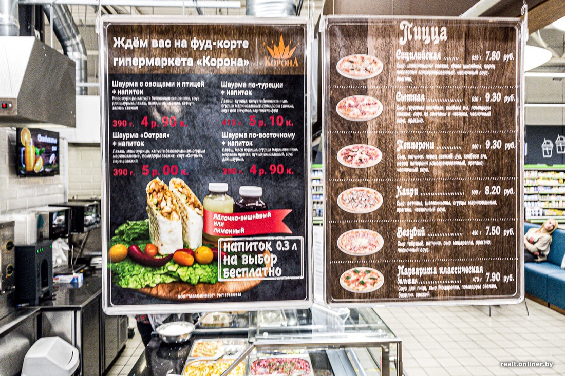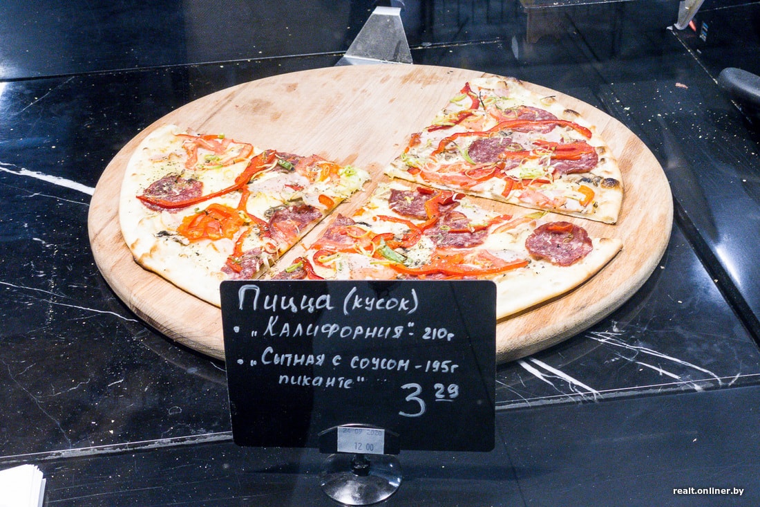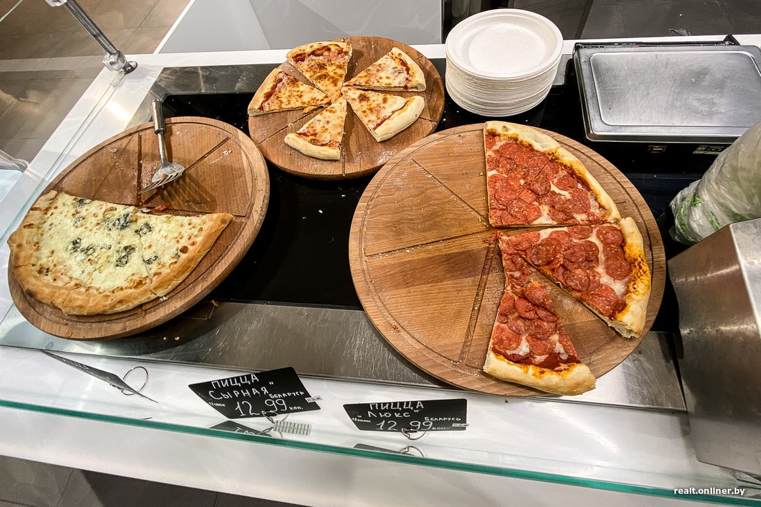 Кроме традиционных блюд (двух видов супа, четырех основных и четырех гарниров) на фуд-корте «Евроопта» можно отведать пиццу, салаты, бургеры и фреши. Пиццу можно купить кусочками или заказать — готовится она за 15—20 минут и по вкусу очень достойная, особенно если учесть ее цену — 6 р. за 600 г, 4 р. за 300 г. Правда, придется выбирать из начинок в виде ветчины, салями, курицы и говядины: вегетарианских пицц, пицц с рыбой или морепродуктами в ассортименте нет.