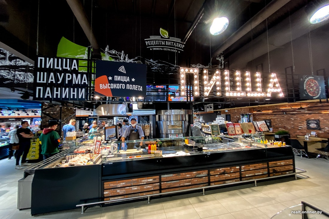 У фуд-корта в «Виталюре» есть свои сильные стороны. Во-первых, это легендарные суши, которые готовятся прямо на глазах у зрителей (и это впечатляет, несмотря на то, что зрителям все равно дадут вариант из-под целлофана). Во-вторых, пицца, которая готовится за 20 минут и ассортимент которой охватывает все вкусы и предпочтения. Например, за 10,49 р. можно купить 400-граммовую морскую пиццу с креветками.