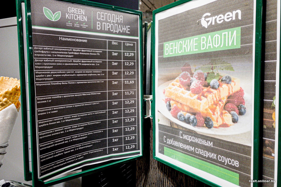 Здесь нет полноценного фуд-корта с котлетами и супами, но есть сокобар, где заодно продаются сэндвичи и мороженое. Цены невысокие: за 4 р. можно купить приличный бургер, за 2 р. — навороченный бутерброд. Мороженое стоит как в магазинах — 1,2 р. за 100 г. А вот фреши выходят недешевые (1,5—2,5 р. за 100 г). Собственно, этот островок в Green скорее похож на буфет, чем на столовую, поэтому оценивать его по общей шкале было сложно. И тем не менее: