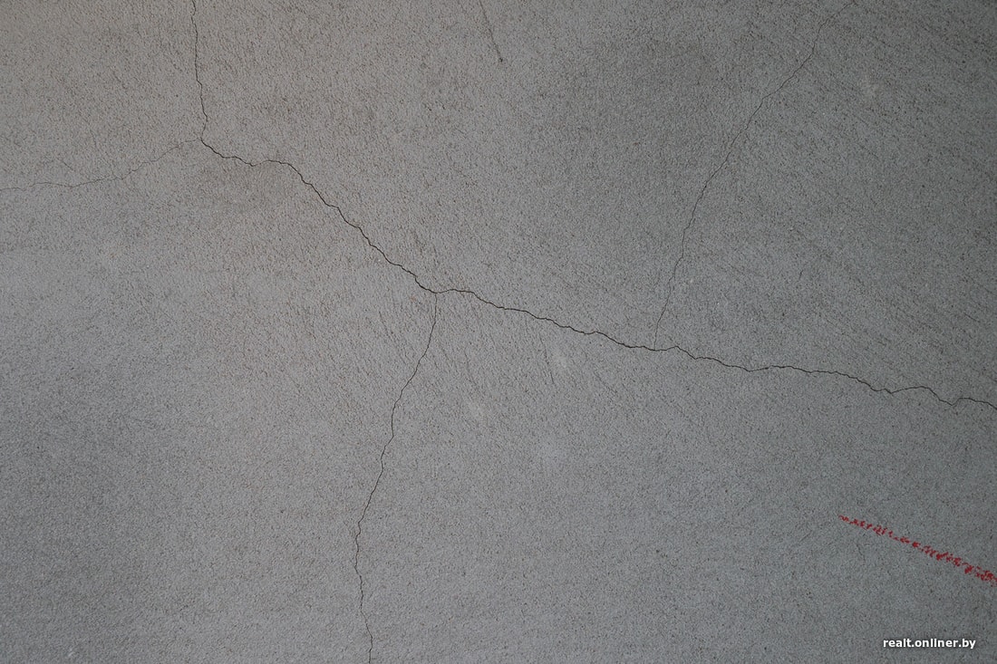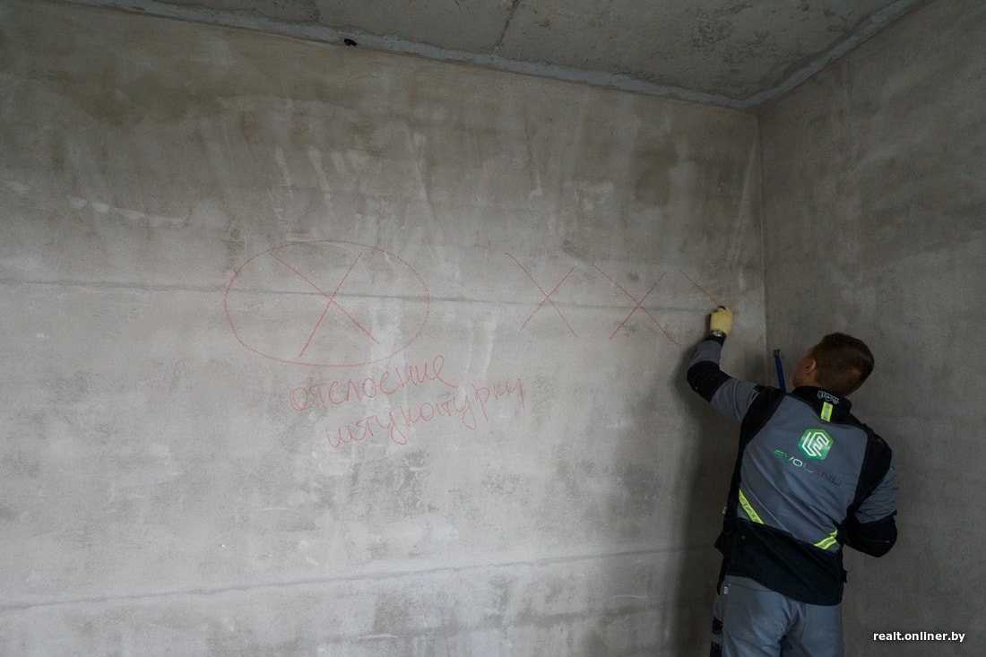 — По стенам ситуация такая: плоскость хорошая, никаких доработок делать не нужно. Вертикаль тоже в допусках — заваленных стен нет. Можно сразу их шпаклевать, поверхности готовы к следующей стадии отделки. Правда, несколько мест в комнате и кухне отмечено крестиками — здесь наблюдается отслоение штукатурки. Застройщику будет необходимо сбить эти участки и заново протянуть штукатурным раствором, — предупреждает Максим Морозов, специалист «Эво Лэнда».