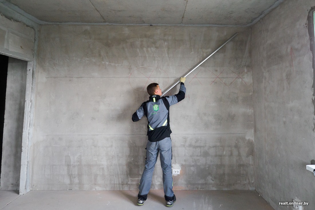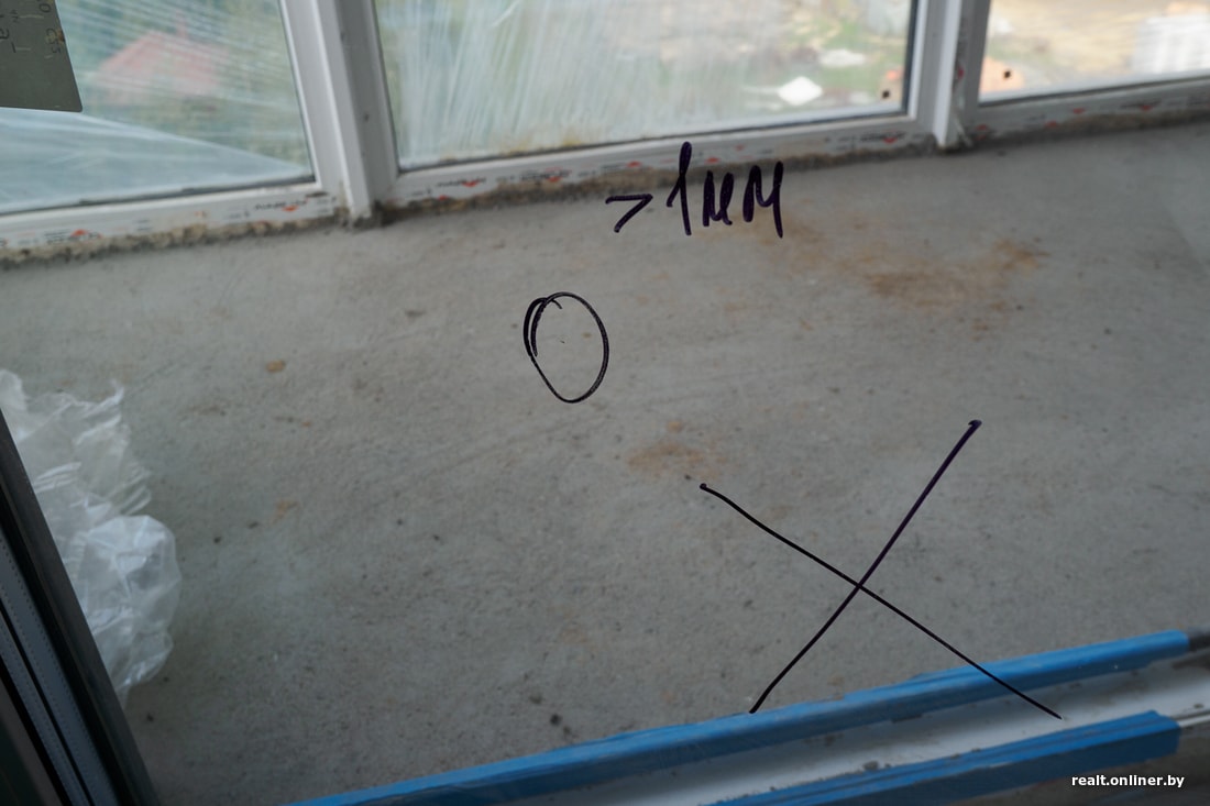 — Что касается стяжки, то в санузле есть несколько мест, где работа очевидно не завершена. В остальной квартире — полный порядок, более того, горизонт идеальный. Вам повезло — такое встречается нечасто, — отмечает Максим.