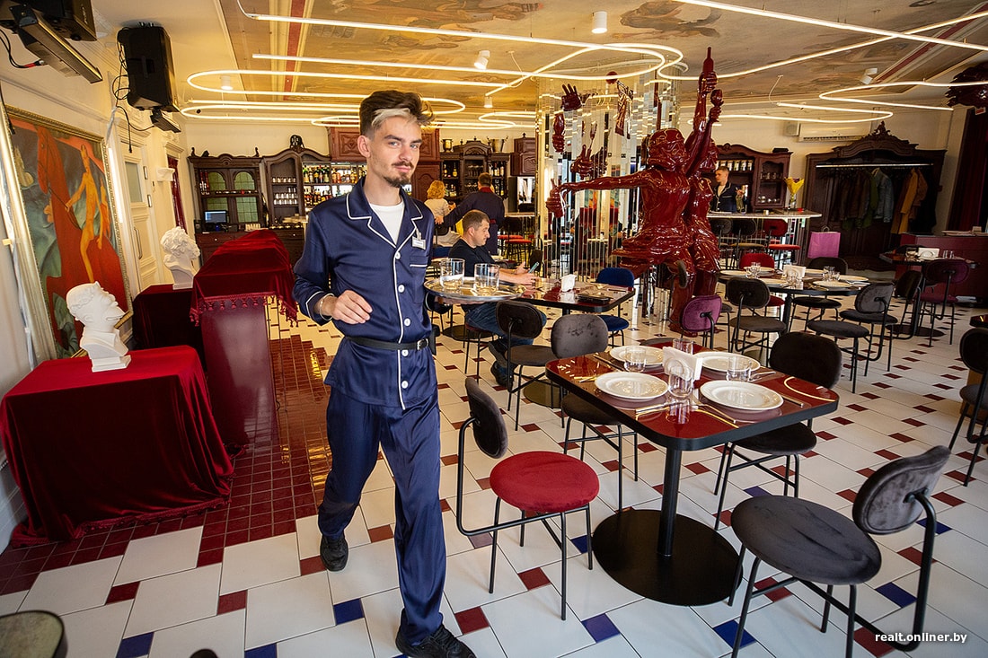 Днем девушки-официантки одеты в костюмы горничных, парни — в пижамы, а метрдотели — в барские халаты. Вечером девушки переодеваются в сарафанчики, закручивая волосы в бигуди, парни — в брюки и рубашки, а метрдотели — в смокинги. Связано это с тем, что девушки, как правило, умеют выглядеть собранно и красиво с самого утра, но на вечеринки всегда опаздывают. А вот с мужчинами все наоборот: им все равно, как выглядеть утром, но к тусовкам они готовятся основательно.