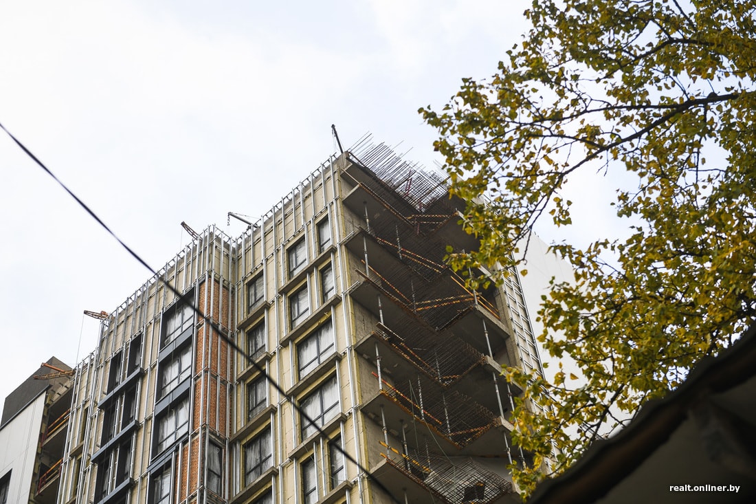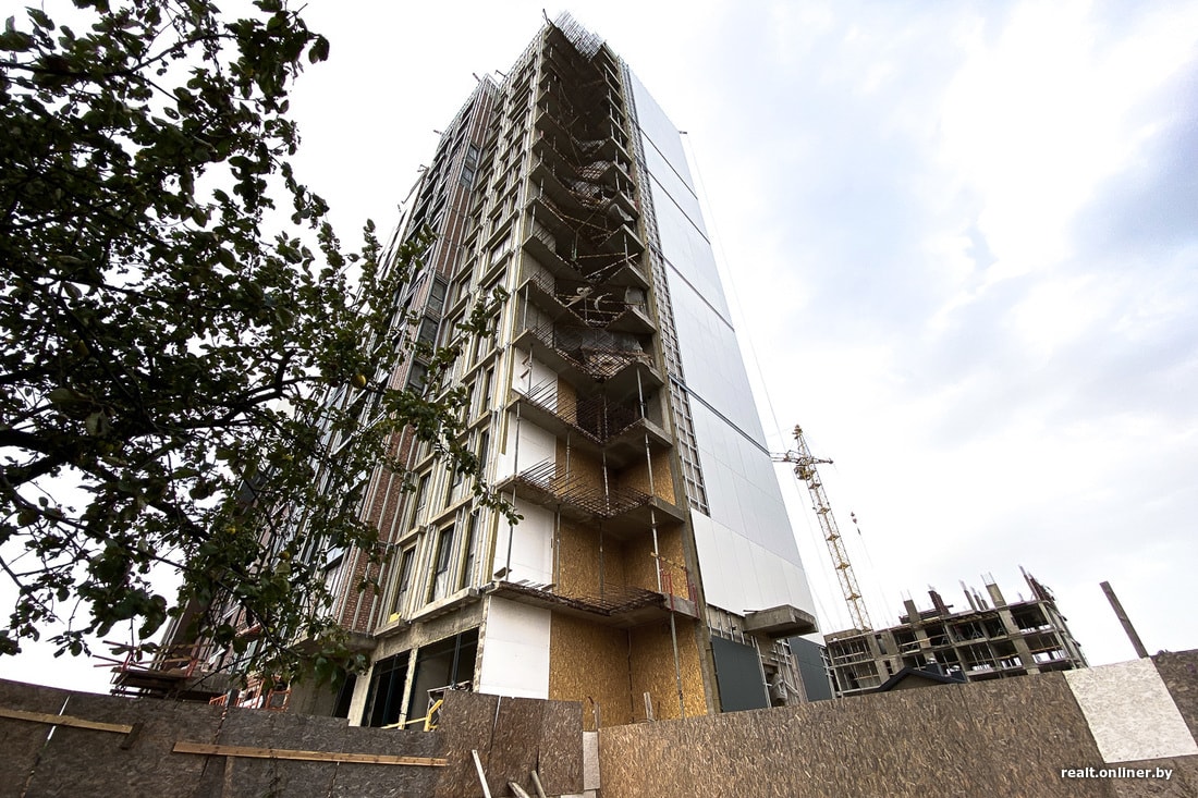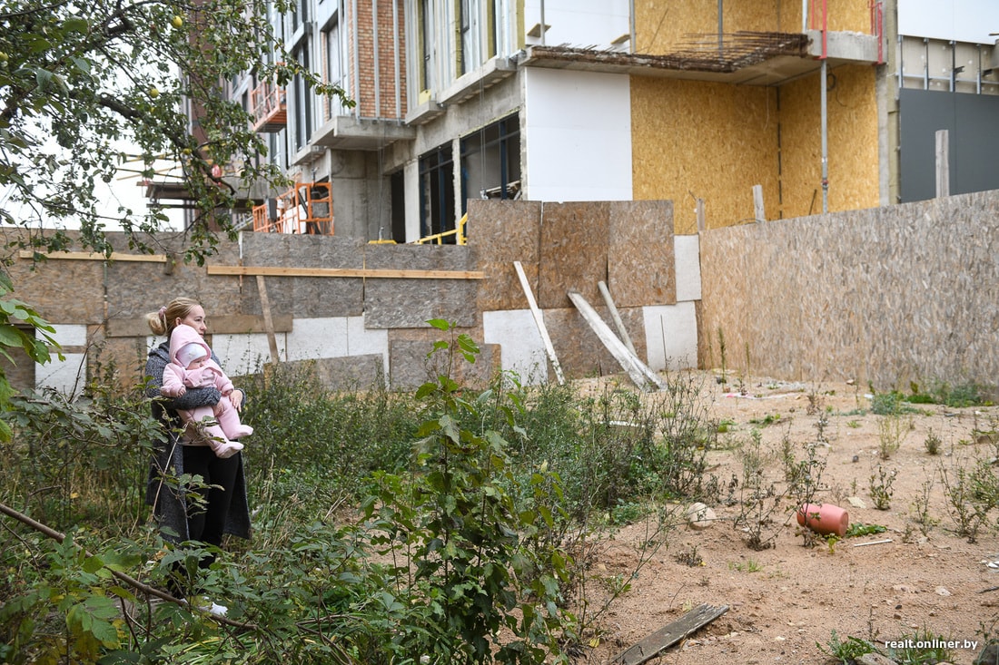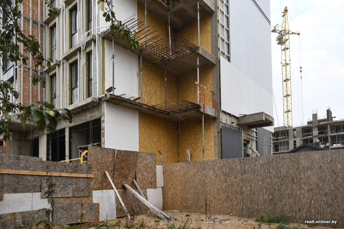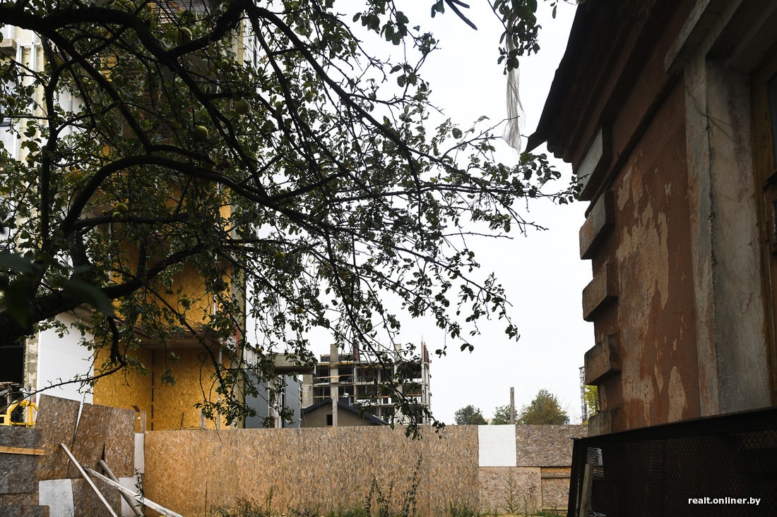 Но выглядит это странно: у фактически готового здания с облицованным фасадом отсутствует целый угол. Сквозь недостроенные внешние стены видна арматура и зашивка из СИП-панелей. Угол здания находится на участке земли, где до сих пор стоит двухквартирный частный дом. Ближе к стройке он уже отселен и выглядит скверно: разбит фундамент, сквозь осыпавшуюся штукатурку видна дранка на фасаде, а рядом на участке — незаросшие рытвины от строительной техники. Жильцы говорят, что однажды ковш экскаватора ударил прямо в стену дома, а забор вокруг участка приходится каждый день подпирать палками, чтобы не рухнул.