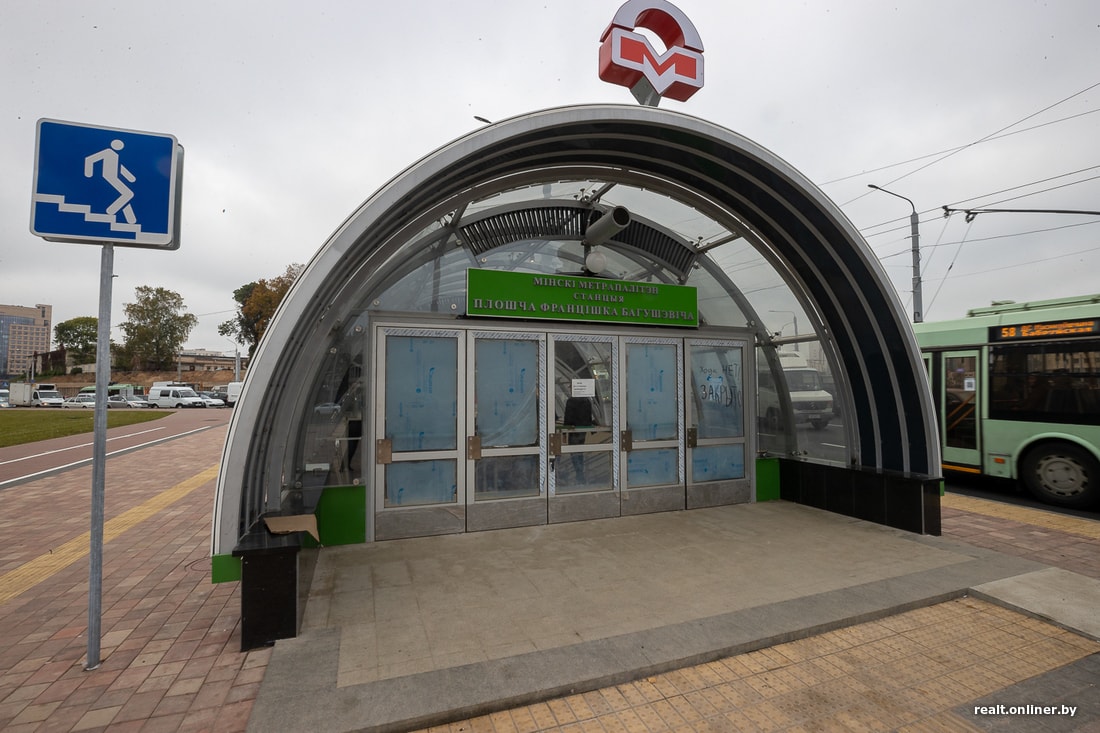 Когда-то на том месте, где сейчас находится черно-зеленый надземный вестибюль, стояли старенькие двухэтажки и доживал свое частный сектор. Все это было снесено, чтобы к 2020-му явить Минску пересадочную станцию метро.