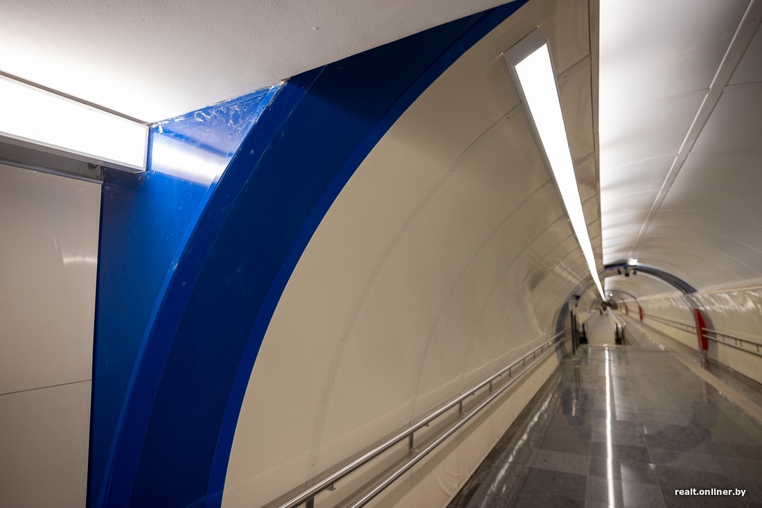 Длина пешеходных переходов разная: один практически 180 метров (речь именно о круглом очертании), другой — 252. К этим цифрам можно добавить еще метров 40 с обеих сторон — их надо пройти до того, как попадешь в тоннель, или после того, как выйдешь из него. Поэтому неудивительно, что здесь были запроектированы травалаторы. Молодежь наверняка будет ходить пешком, так как это быстрее, а вот старшее поколение явно оценит ноу-хау нашего метрополитена.
