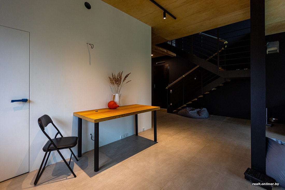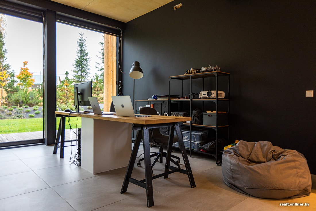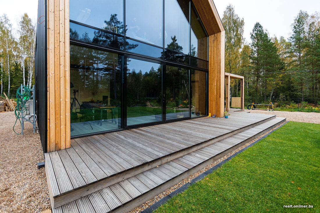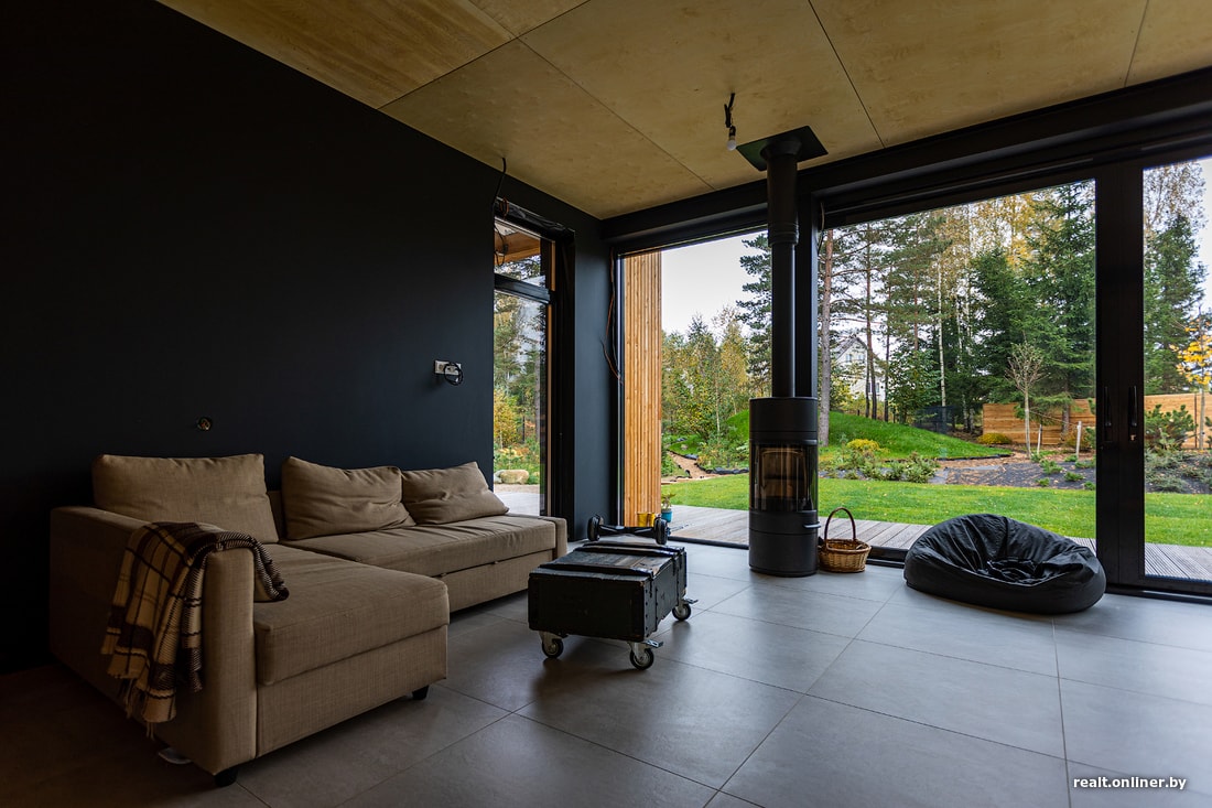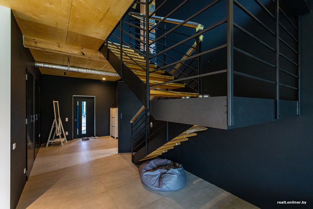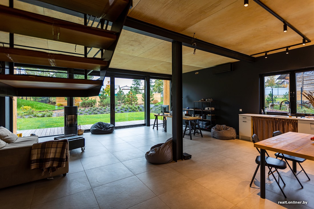 Благодаря крутой архитектуре ребята смогли обойтись довольно простой отделкой. Например, потолок здесь облицован обычной фанерой, которая в Беларуси считается черновым материалом. Но сама архитектура вышла весьма недешевой. Например, одна из внешних стен полностью состоит из энергоэффективного стекла с шумоизоляцией. Размер витража — 7,5 метра в коньке и 7,5 метра у основания, а цена — 25% от себестоимости коробки без фундамента.