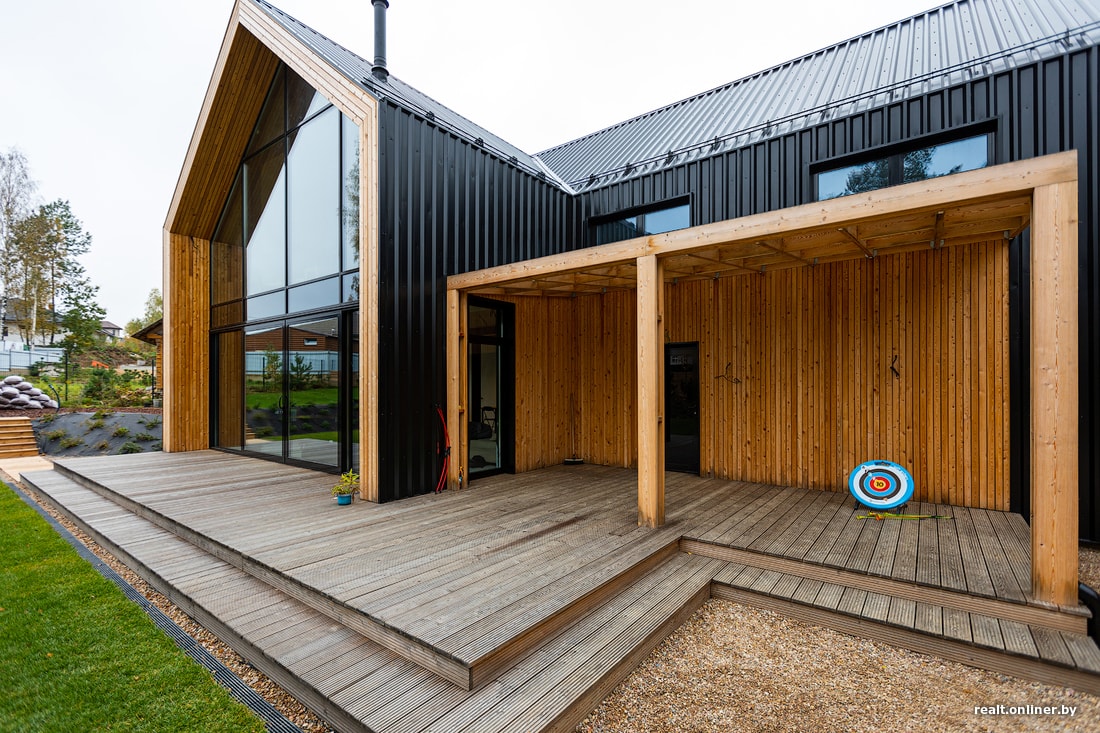 А так дом выглядит с фасада. Крыша отделана металлопрофилем — тем материалом, который обычно используется для строительства заборов. Стены отчасти облицованы им же, отчасти — планкеном из лиственницы.