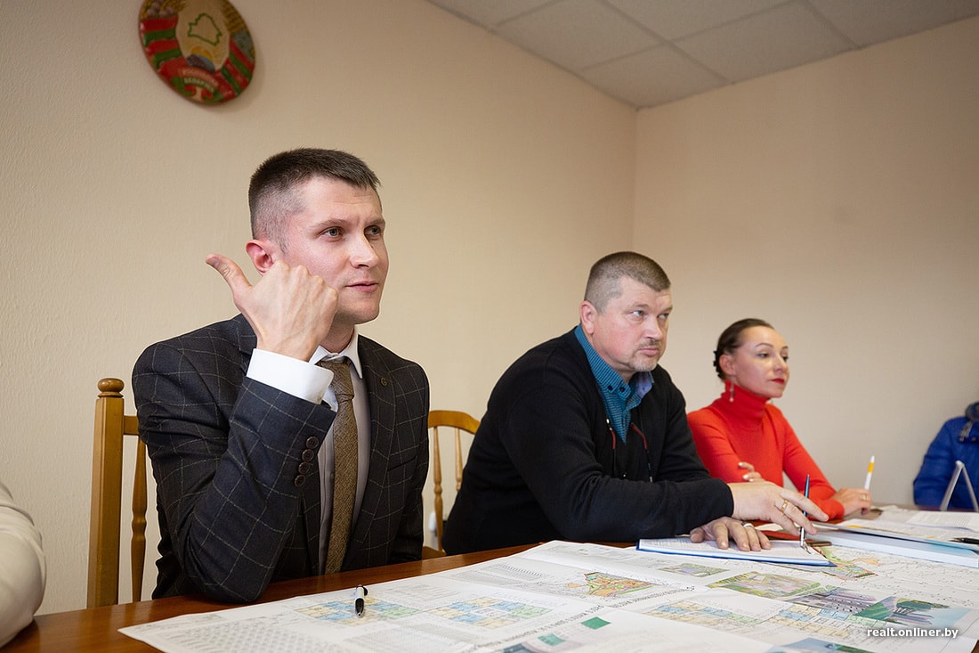 На часах — 16:00. Казалось бы, рабочее время, но в сельсовете уже не протолкнуться: желающих обсудить новый проект оказалось так много, что пришлось искать дополнительные стулья. Защищаться от эмоциональных нападок и тонны вопросов, которые обычно возникают на подобного рода мероприятиях, приготовились четверо: начальник управления архитектуры и строительства Минского райисполкома Роман Воравко, его заместитель Екатерина Зайцева, представитель заказчика проекта ЖСПК «Солнечный-2020» Дмитрий Попов и главный архитектор проекта Игорь Шакаль.