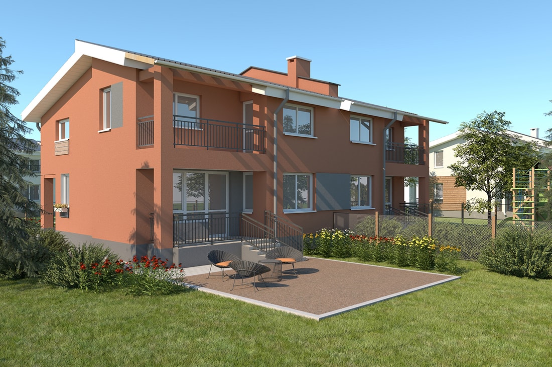 Дома возводятся из керамзитобетонных блоков (по своим свойствам этот материал выигрывает у газосиликата), наружные стены утепляются пенопластом и штукатурятся. Крышу накрывают профилированным листом. Каждая квартира будет обеспечена площадкой для парковки автомобиля. Участки обнесут забором: между соседями — сетка, с улицы — деревянный штакетник. На заднем дворе предусмотрена небольшая терраса и площадка для отдыха. Земля будет принадлежать жильцам на праве частной собственности. Площадь не большая, но и не малая: 6 соток — как дачный участок.