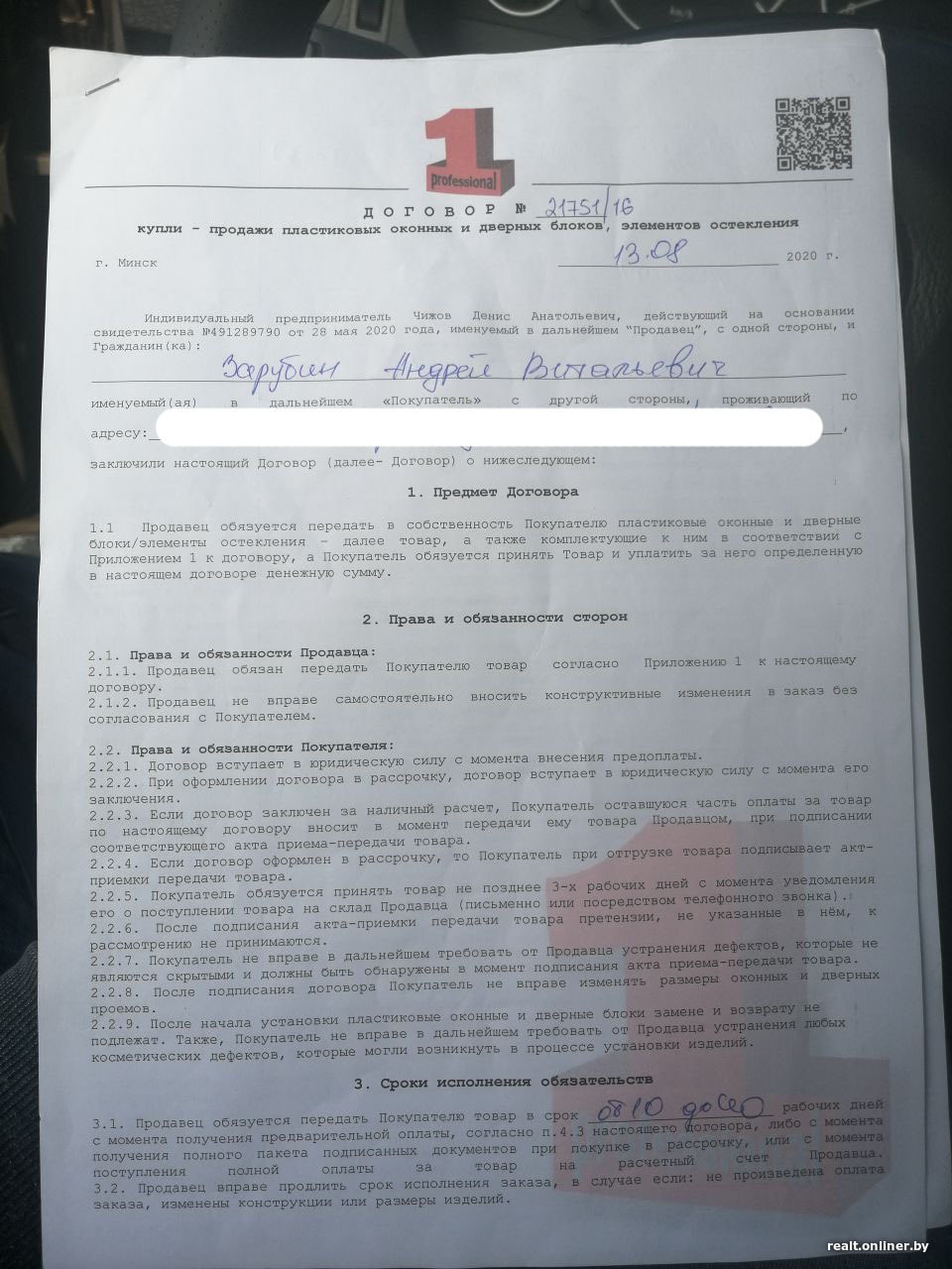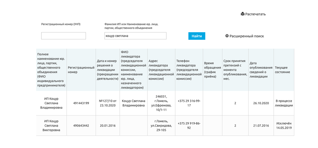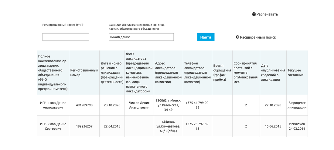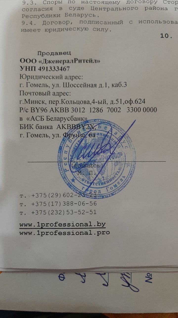 Когда пострадавшие стали копать под 1professional, вскрылась еще одна интересная деталь. От имени компании договоры заключали сразу несколько лиц: два физических (ИП Чижов Денис Анатольевич, ИП Коцур Светлана Владимировна) и два юридических (ООО «Дженералритейл» и ЧТУП «Уан Профешнл», директором которого является Чижов). Оформлены они были абсолютно одинаково, даже бланки совпадали. Что примечательно: все вышеперечисленные лица, если верить журналу «Юстиция Беларуси», 23 октября подали заявления на ликвидацию.