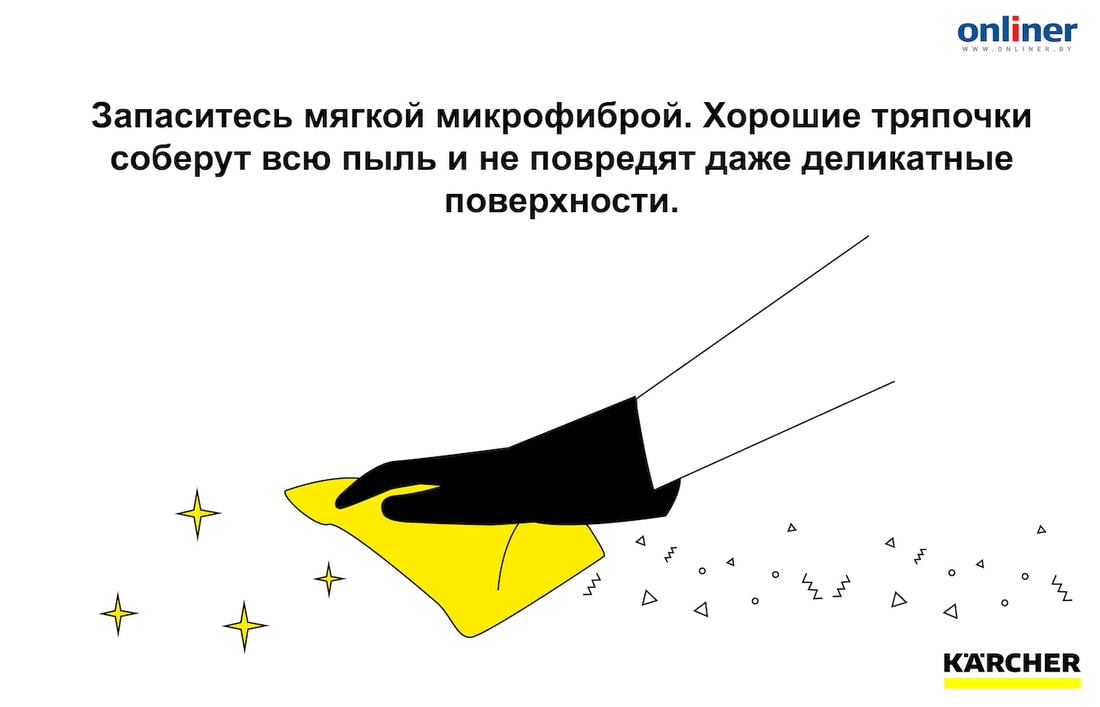 — Приступая к уборке, раз и навсегда забудьте о существовании ветоши, старых маек, бабушкиных простыней и так далее. Проведя такой тканью по крашеной стене, вы ее наверняка заглянцуете или поцарапаете. Все, что вам нужно, — запас качественных тряпочек из микрофибры. Микрофибра хорошо собирает послестроительную (и любую) пыль, не портит поверхности.