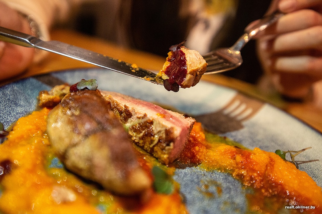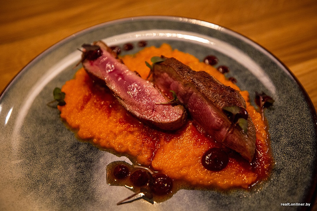 Ждем утку с морковным пюре и гелем из ежевики. Приготовили относительно быстро, но не спросили про степень прожарки и принесли в состоянии, похожем на Medium Well. Но в целом мясо получилось мягким, сочным, без неприятного привкуса. Пюре из моркови пряное и подходящее к утке. Но гель из ежевики — почти как слезы феи. То есть его почти не было. Утка требует больше кислого соуса — зачем его жалеть?