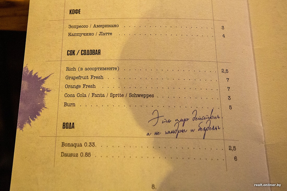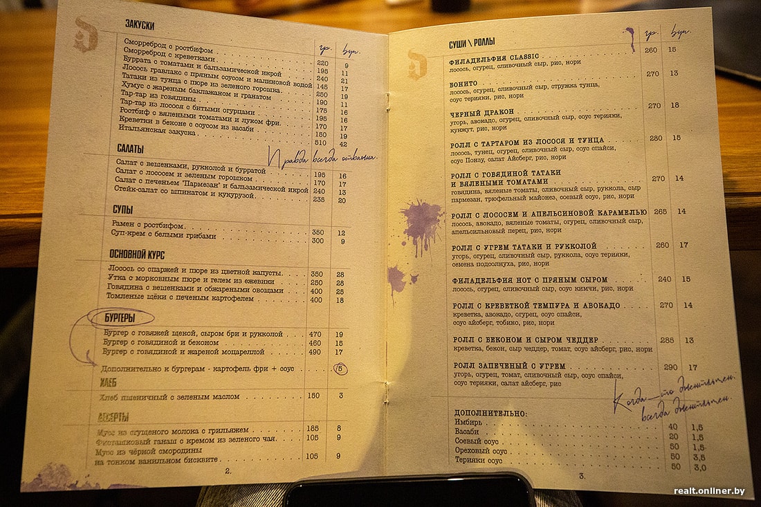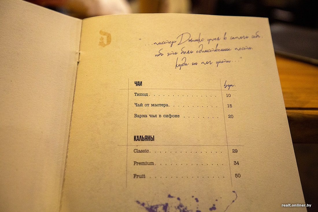 Меню похоже на книгу или рукопись с пометками и кляксами — скорее всего, это отсылка к творчеству самого Диккенса. Позиции составлял перфекционист, желающий угодить всем и сразу.