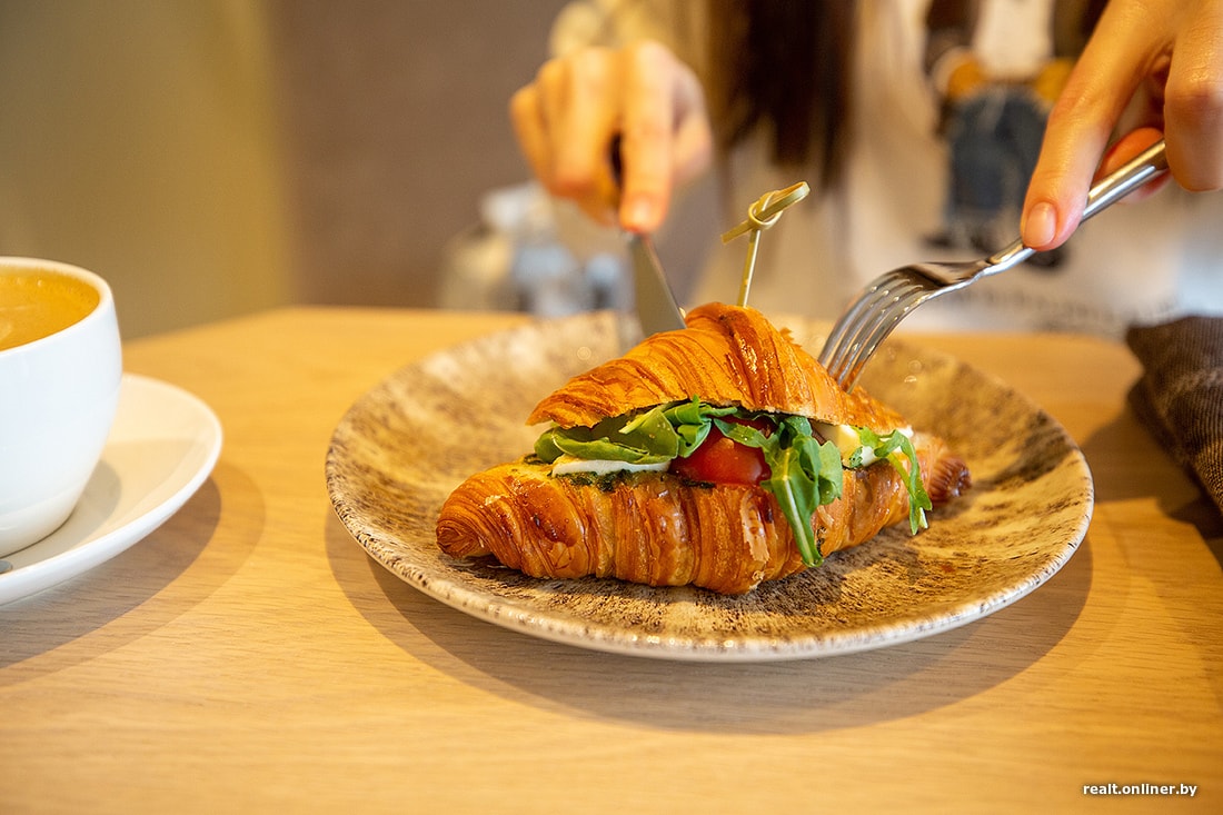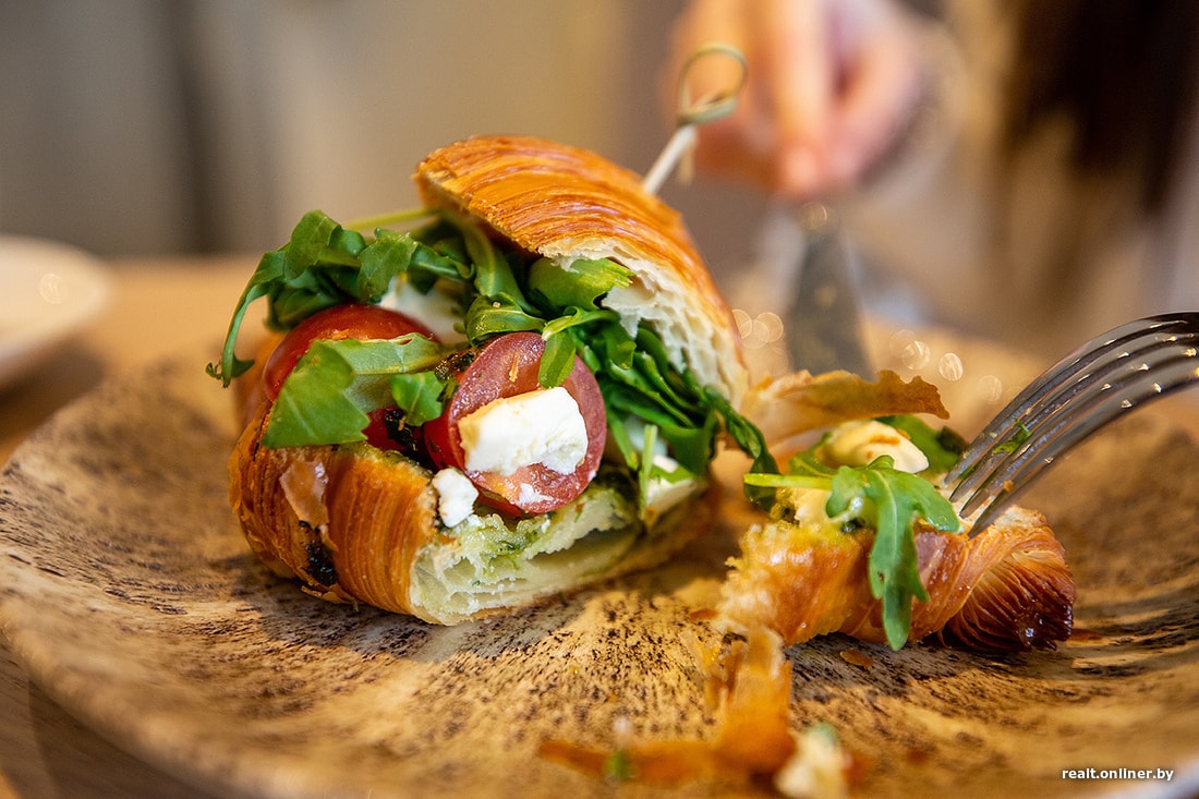 Круассан с черри, сыром и соусом песто может заменить завтрак. Круассан свежий, хрустящий сверху, но внизу пропитался соусом и размяк. Вкусовых качеств это не испортило.