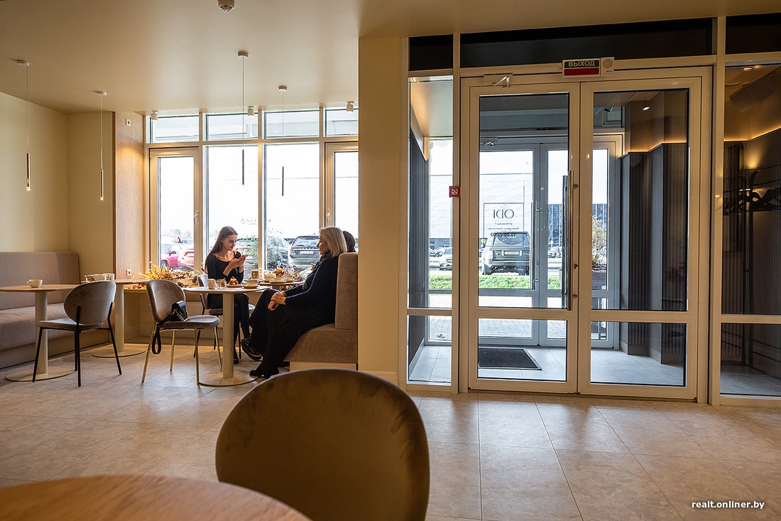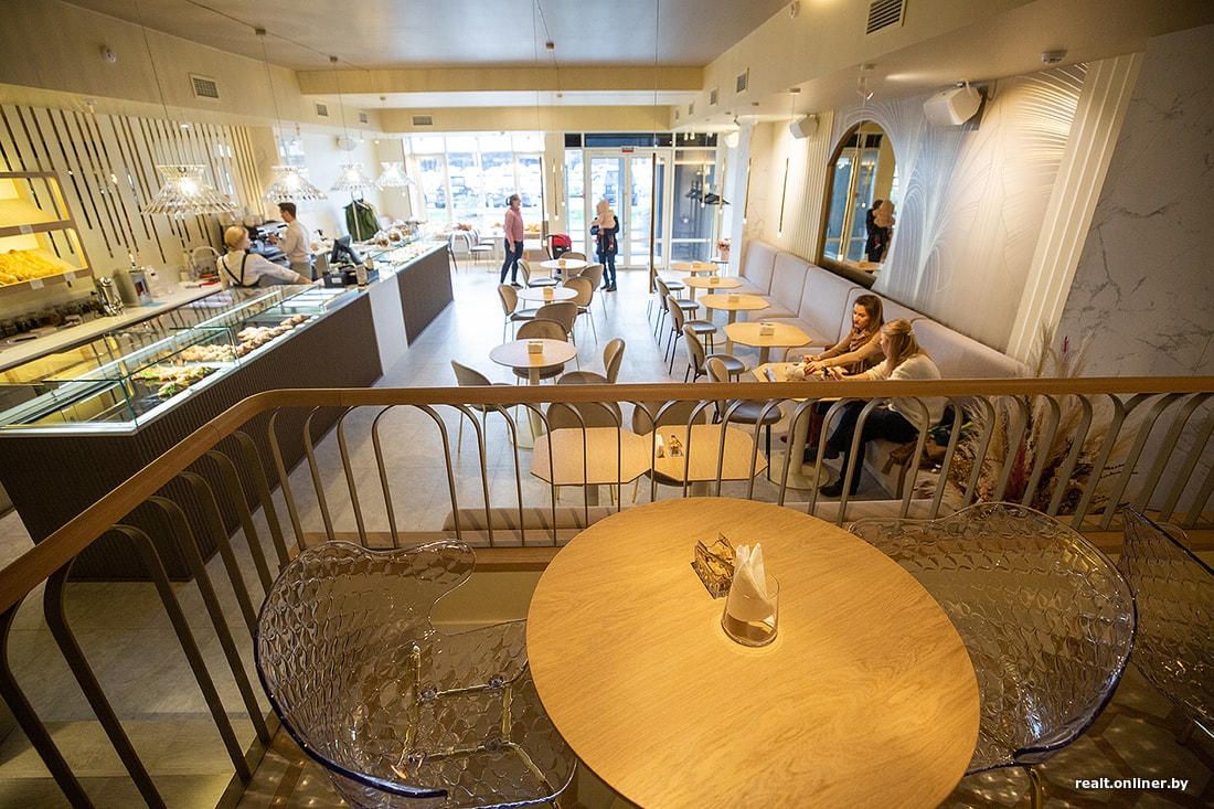 Атмосферка в день открытия тут была семейная. Всех пришедших угощали бесплатным шампанским и конфеткой. Чаще всего заходили мамочки с колясками, вероятно из домов неподалеку. За одним из столиков компания нарядных девушек отмечала чей-то день рождения. А за окном — холод и моросящий дождь. Прямо кусочек идеального мира посреди высоток.