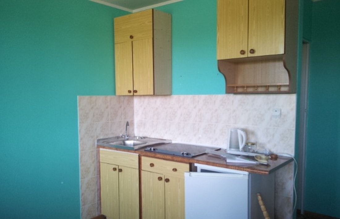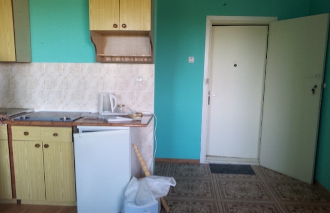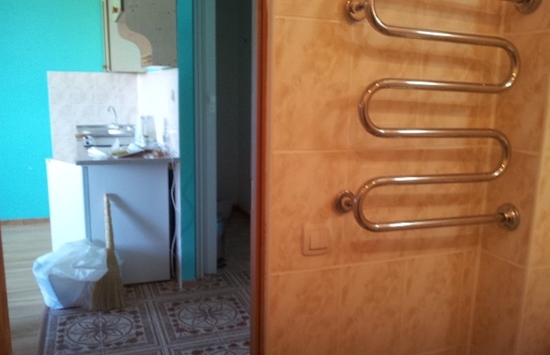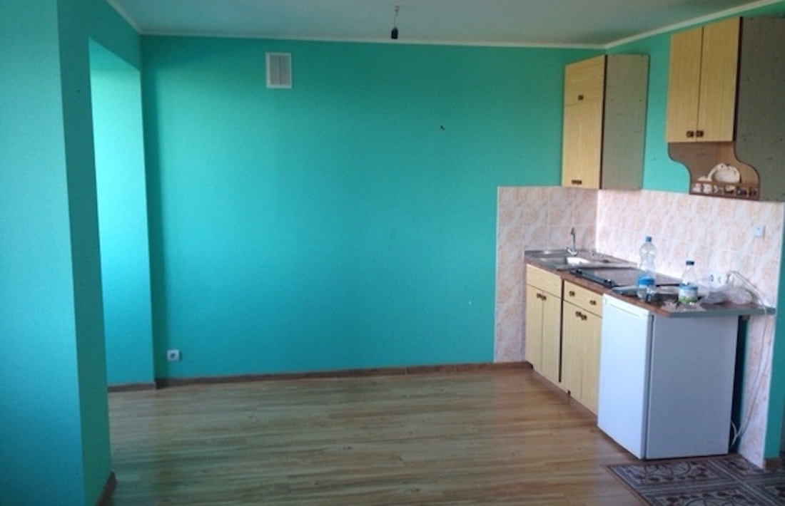 За €4300 — еще один вариант со свежим, но спартанским ремонтом. Стены покрашены в ярко-мятный цвет, из мебели — встроенная кухня, шкаф и раскладушка. Общая площадь — 29 «квадратов», 8-й этаж 9-этажки.