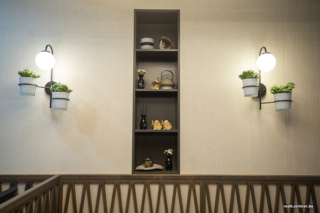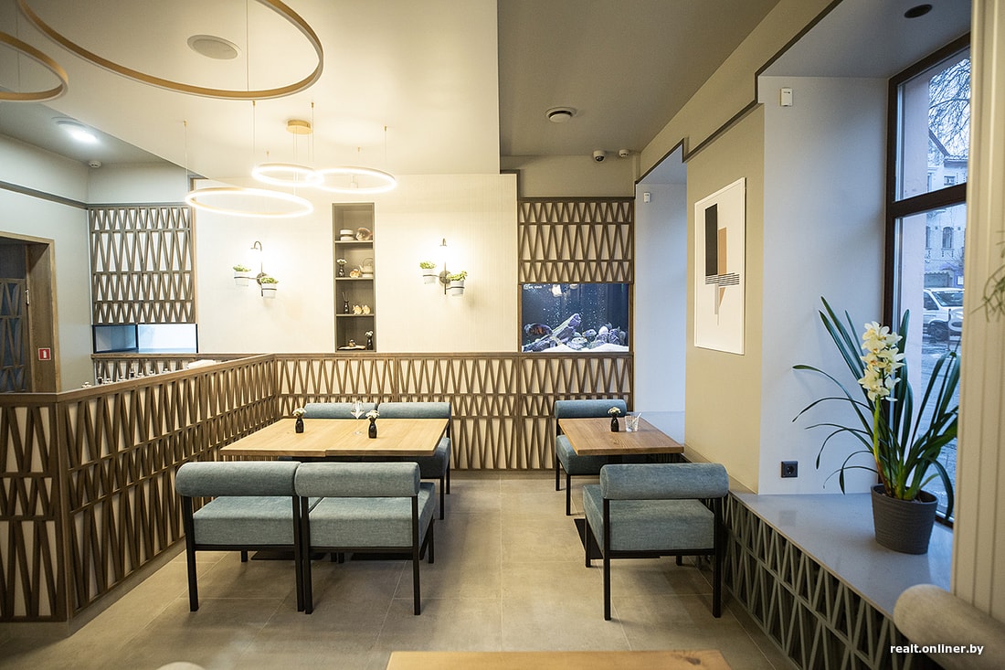— На момент начала ремонта мы уже знали, что дизайнером проекта станет Ольга Антропова. Нам импонировали ее состоявшиеся проекты и работы, а большим бонусом являлось то, что она не только любительница вкусных роллов и суши, но и живет в этом районе, а значит, чувствует ауру этого места. Цветовая палитра заведения выбиралась из оттенков моря, гальки, песка и цвета лосося.
