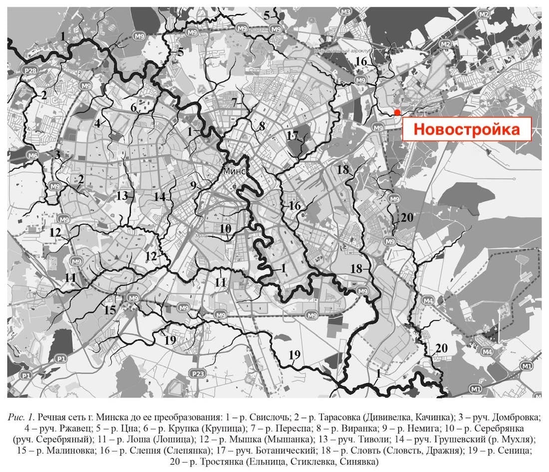 Люди рассказывают, что на месте современной улицы Купревича раньше было болото и проток реки Слепня (она же — Слепянка). Это подтверждает и старая карта речной сети, которую в Академии наук нанесли на современную карту Минска. Красной точкой мы обозначили место, где возводят проблемную новостройку.