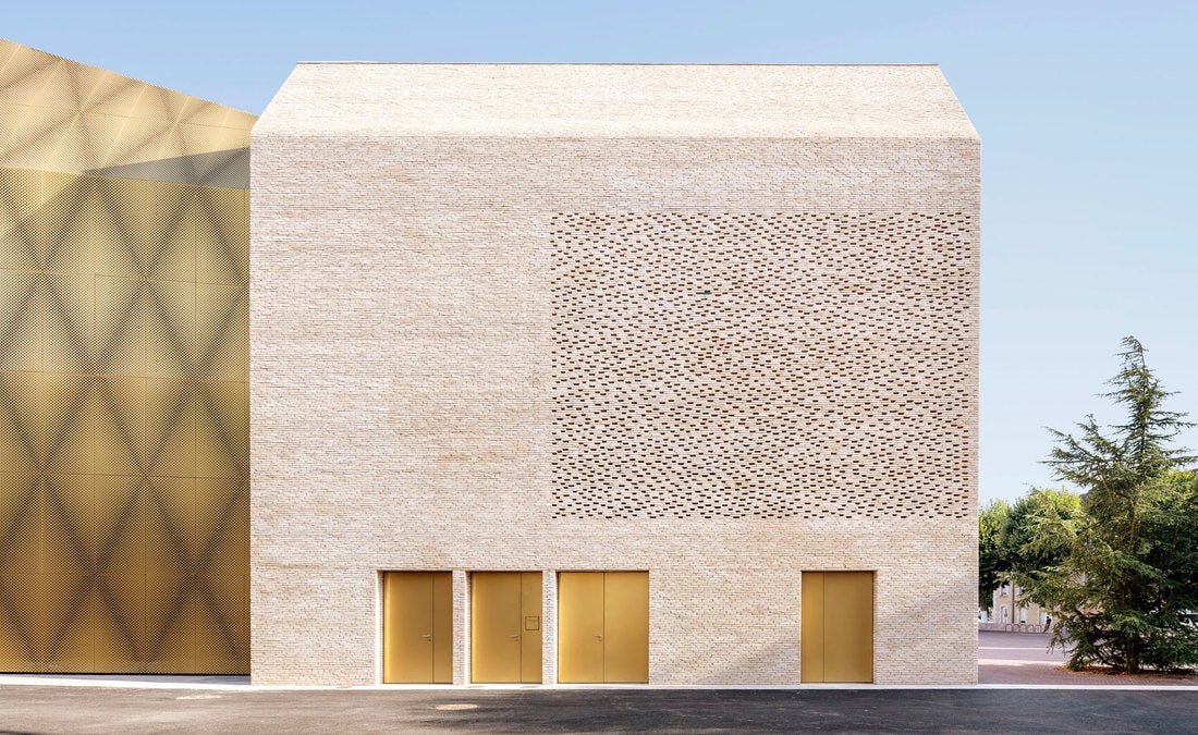 Это прекрасный пример восстановления общественного пространства в исторической среде, но при этом без использования вторичных реплик, пытающихся копировать прежнюю архитектуру. Ранее территорию площади во французском Каоре занимала автостоянка, которая теперь возвращена городу в новой ипостаси. При этом ее главным элементом стал культурный комплекс (кинотеатр и Музей сопротивления), соответствующий масштабами и формами окружающим его малоэтажным старым казармам. Никакой попытки мимикрировать под эту застройку нет, объект очевидно свежий, и эта свежесть выглядит даже слегка вызывающе, но все же элегантно. Кирпичная кладка цвета пудры, с фактурной перфорацией вновь показывает, насколько и сейчас актуален этот, казалось бы, скомпрометированный у нас в стране материал. Кирпич соседствует с латунными вставками и даже дверями золотого цвета. В работе с такими оттенками очень сложно соблюсти рамки приличия и не скатиться в китч, однако парижским архитекторам из студии Антонио Вирги это прекрасно удалось.
