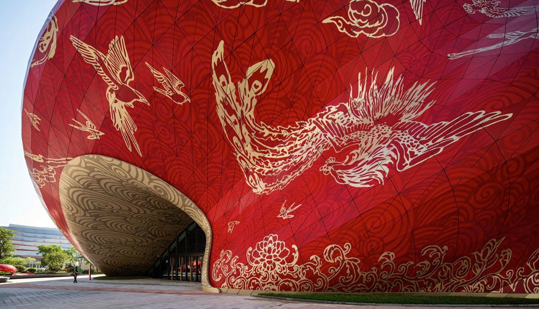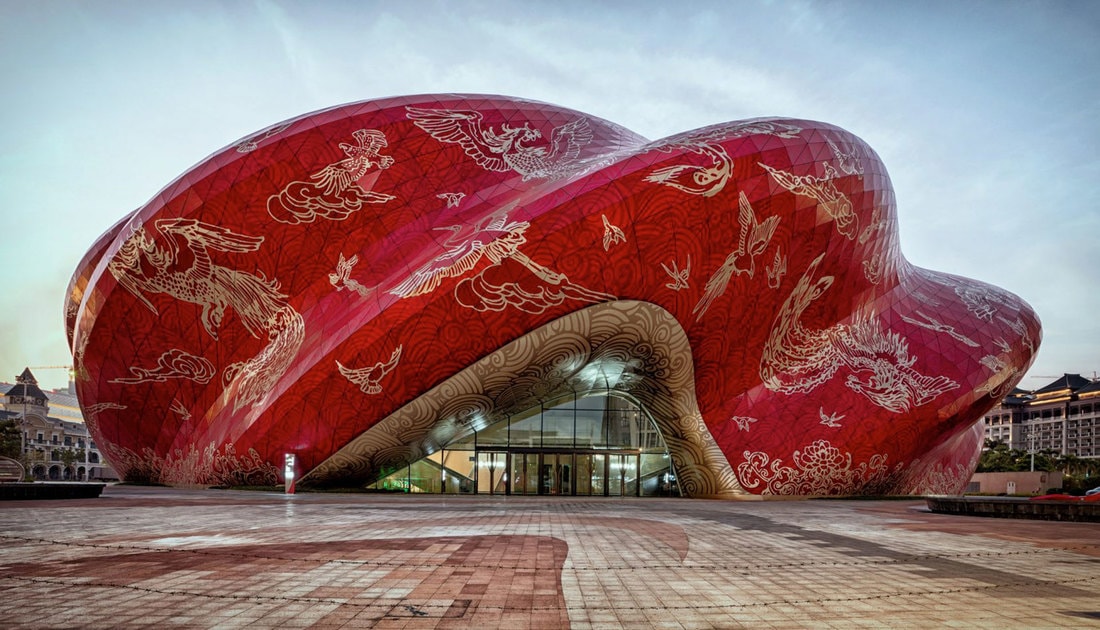 Даже в коронавирусный год страна, в которой все и началось, не подвела. Самая мощная строительная отрасль мира продолжала выдавать на-гора объекты на любой вкус: от районов массовой застройки и небоскребов в несколько сот метров до статусных общественных зданий и камерных упражнений в скромном масштабе. В Гуанчжоу девелоперская компания Sunac построила театральное здание, которое должно привлечь внимание публики (местных жителей и туристов) к застраиваемой ей территории, ранее не пользовавшейся особой популярностью. Британскому архитектору Стивену Чилтону, который является автором уже нескольких китайских «гранд-театров», в этот раз удалось превзойти самого себя. Эффектная конструкция, облицованная алыми панелями, напоминает сверток шелковой ткани (отсылка к текстильному прошлому города), а рисунки на ней не дают забыть об искусстве традиционной китайской татуировки.