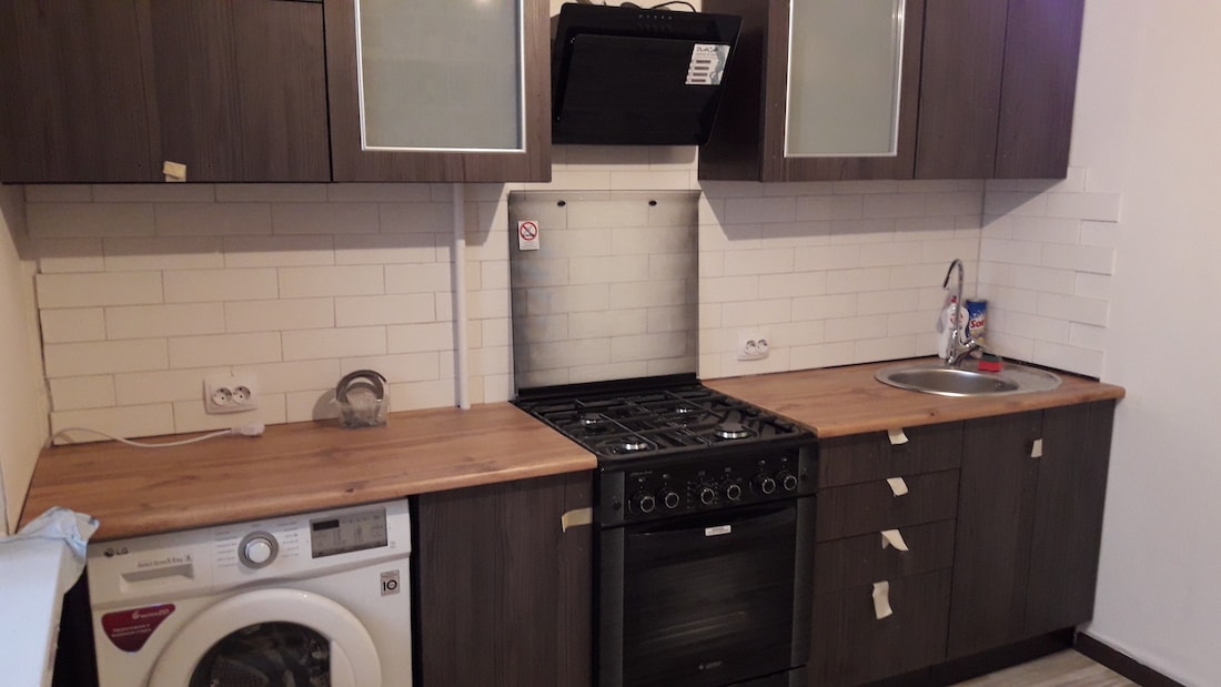 Кухонный гарнитур заказали заранее в местной ЧУП «Сенира» (за 830 рублей), чтобы за время, пока его делают, мы смогли подготовить само помещение. Под заказанный кухонный гарнитур выбирали плитку, обои и линолеум. Сразу решили, что потолок будет натяжной белый сатиновый (вышел около 180 рублей, заказывали через студию натяжных потолков P&P).