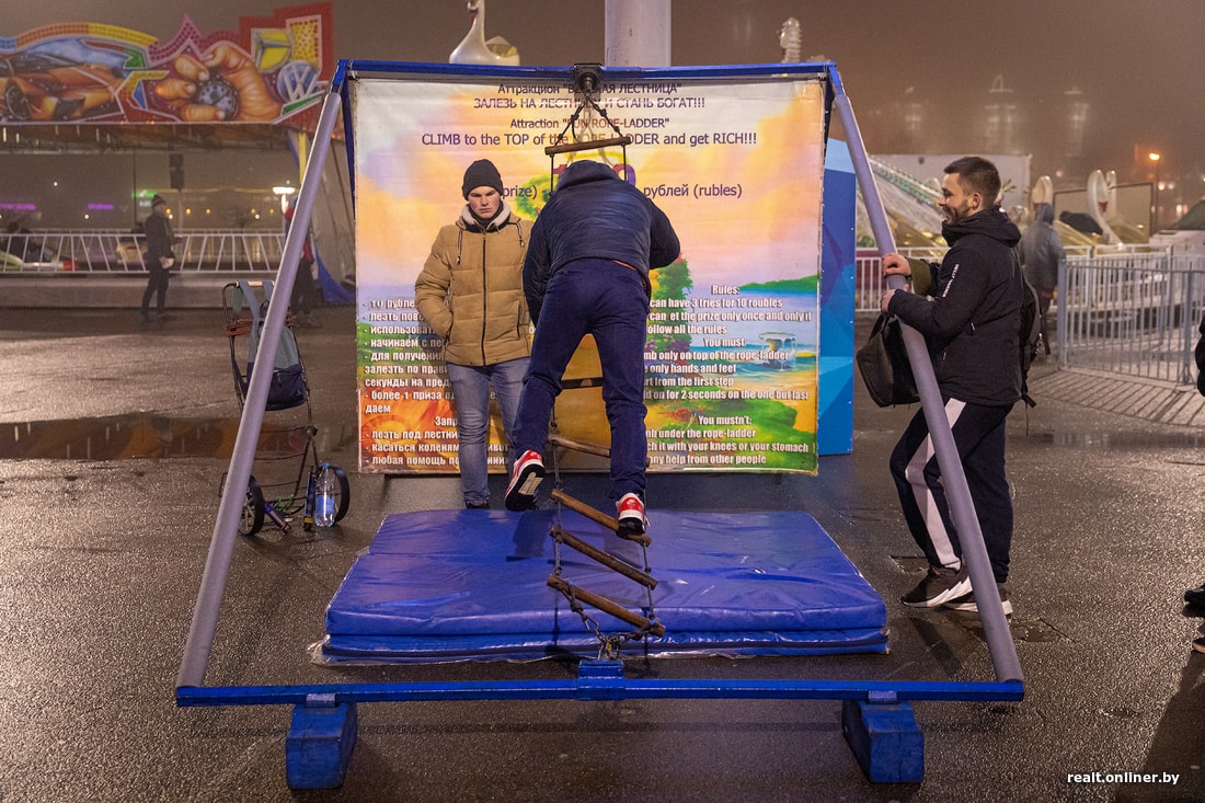 Еще одна точка притяжения для всех, кто признает зимние праздники, — новогодняя «галерея» в начале проспекта Победителей. Ряды ларьков с едой и сувенирами, красивая елка, аттракционы и развлечения для малышей. Продавцы из киосков говорят, что иностранцы тут — не такая уж и редкость, правда непонятно, то ли это «свои» (студенты, посольские, «переселенцы»), то ли взаправдашние туристы. Главное, что не проходят мимо и покупают все, что видят.