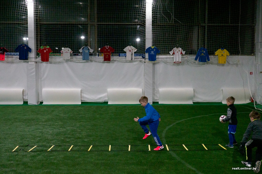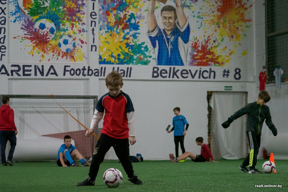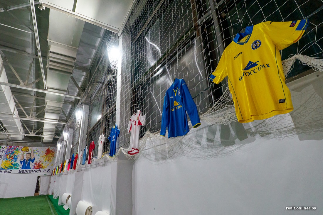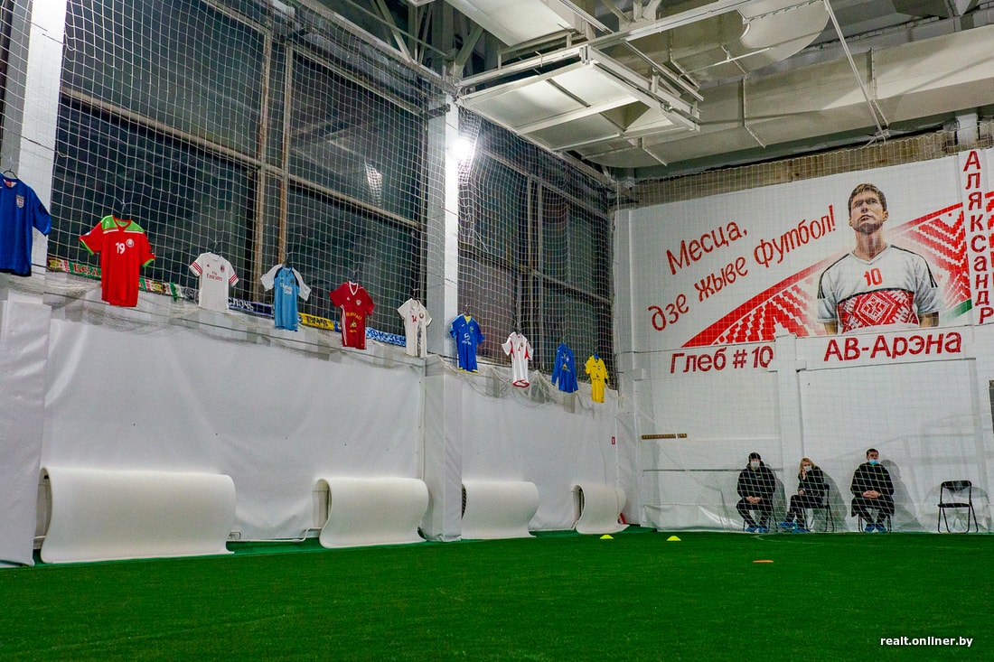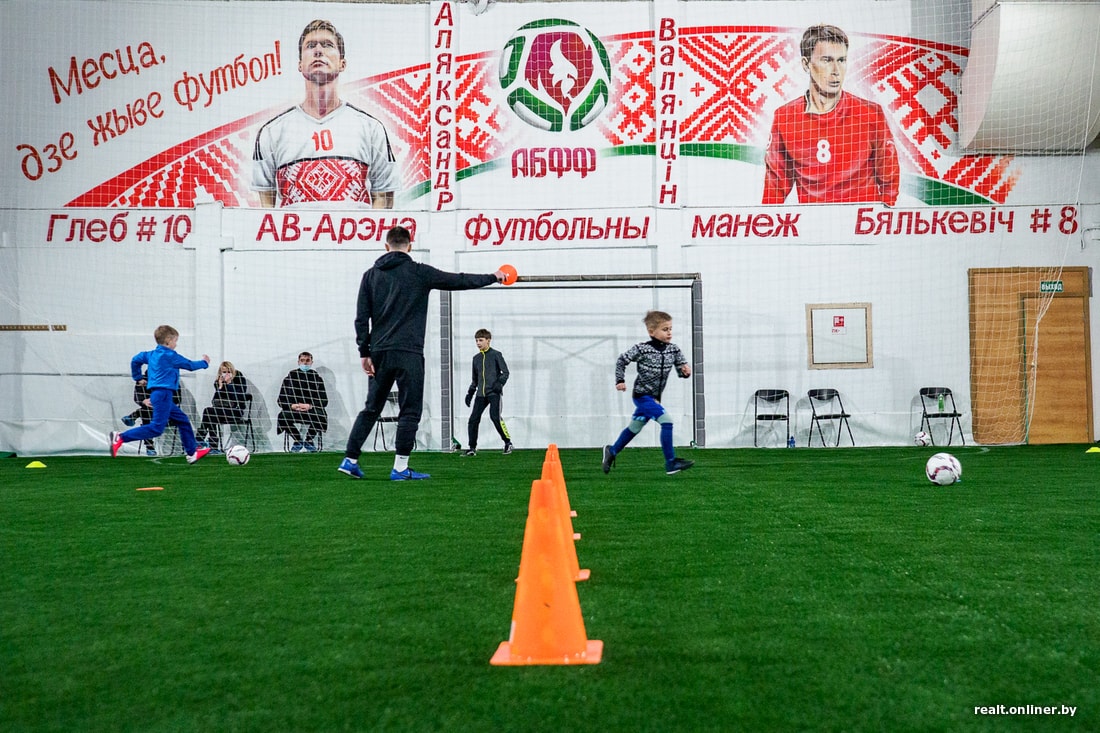 — С самого начала мы, как любители футбола, решили, что будем создавать в своем манеже особую атмосферу: не просто крашеные стены скучного цвета, а что-то запоминающееся. Так появилась надпись «Месца, дзе жыве футбол», а еще портреты лучших, по нашему мнению, футболистов в истории суверенной страны — Александра Глеба и Валентина Белькевича. Уверен, что дети, которые будут приходить тренироваться в зале, должны знать этих людей, их достижения и роль белорусском спорте.