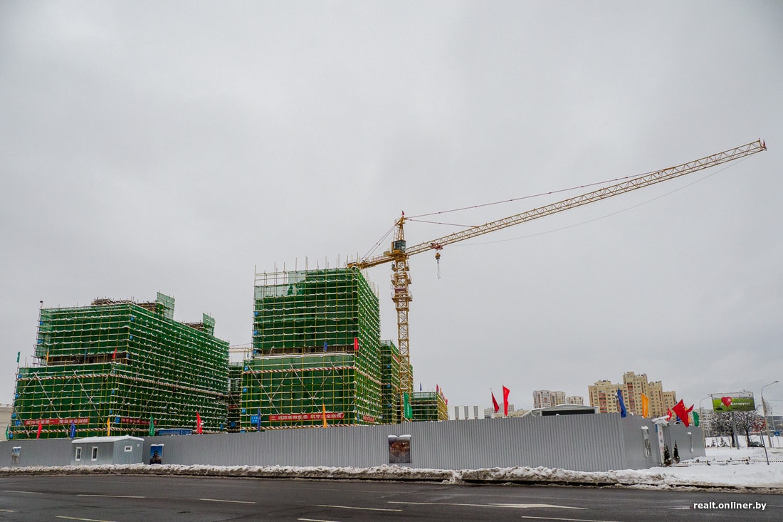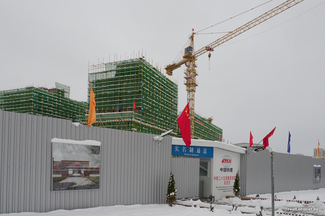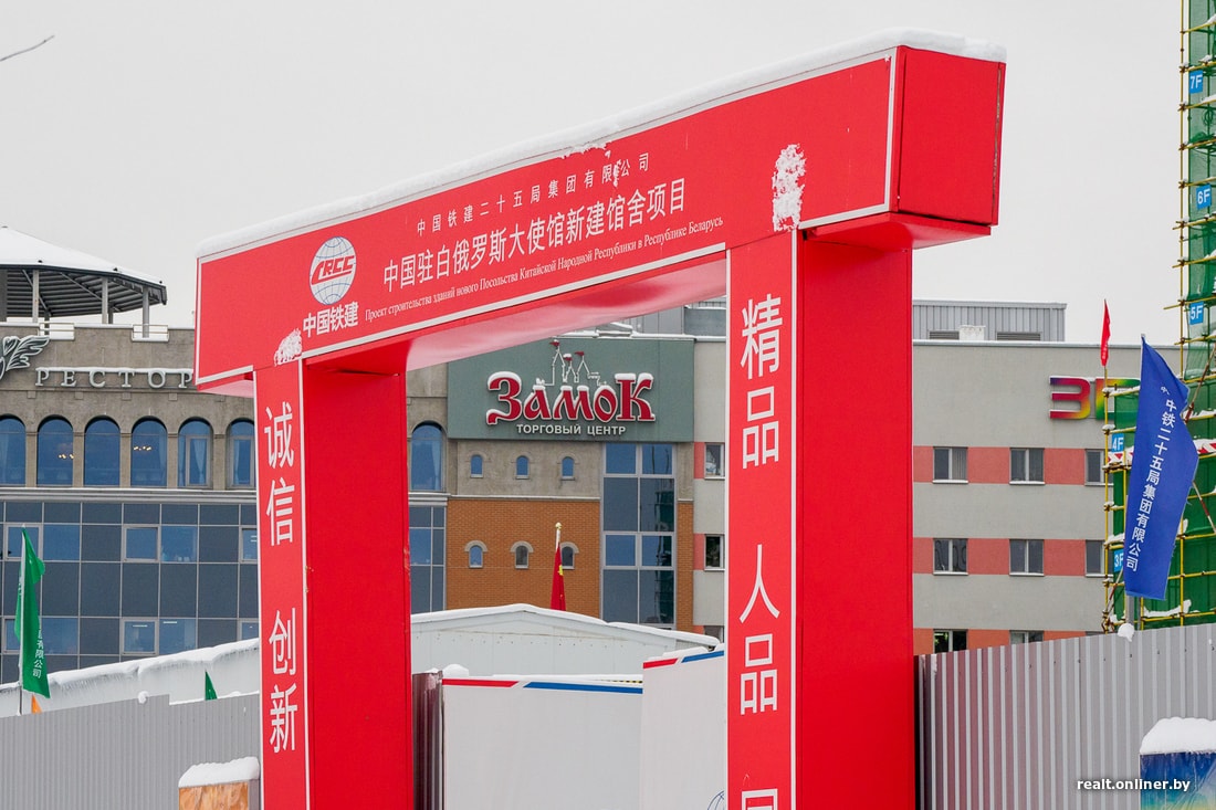 С середины июля 2019 года возле ТЦ «Замок» идет большая, нет — огромная стройка. На площади в полтора гектара за серым металлическим забором возводится китайский «город». Официально — здание посольства дружественной страны, но если в остальных «дипломатических» случаях мы привыкли видеть пусть и масштабную, но одинокую постройку на клочке белорусской земли, то в данном варианте на проспекте Победителей формируется целый комплекс зданий, в котором также нашлось место для жилья сотрудникам.