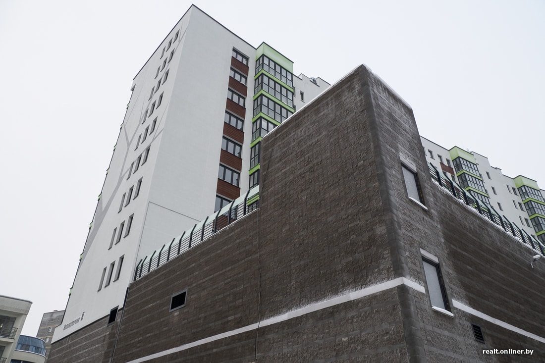Так многоэтажка выглядит сегодня — уже понятно, где входы в подъезд, где заезд на паркинг и что акцент в доме сделан на салатовом и коричневом цветах. Ну что, веселенько.