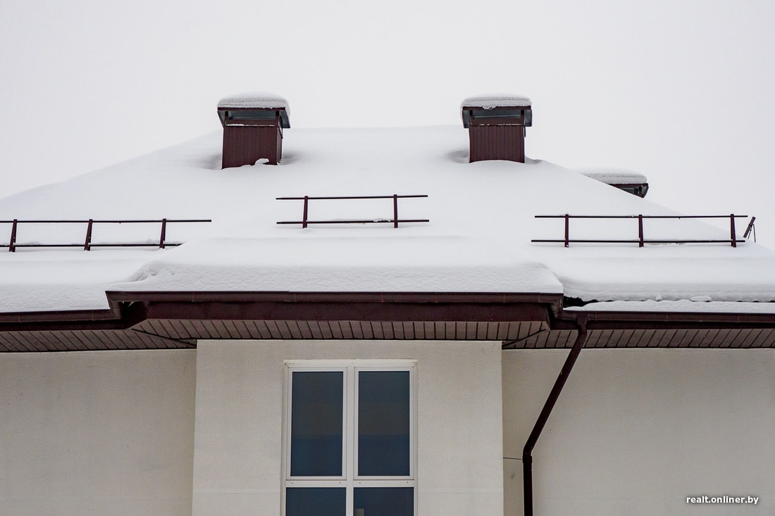 Что же такое коттедж по-уксовски? Каждый дом представляет собой двухэтажное здание с цокольным и двумя жилыми этажами, а также чердаком. На цокольных этажах располагаются технические помещения, гараж, котельная. На первом и втором этажах — холл с лестницей, санузлы, гостиные, спальни. Наружные стены выполнены из блоков ячеистого бетона толщиной 500 мм, внутренние поперечные стены — из кирпича толщиной 380 мм. Кровля скатная — стропильная система из деревянных конструкций с покрытием металлочерепицей.