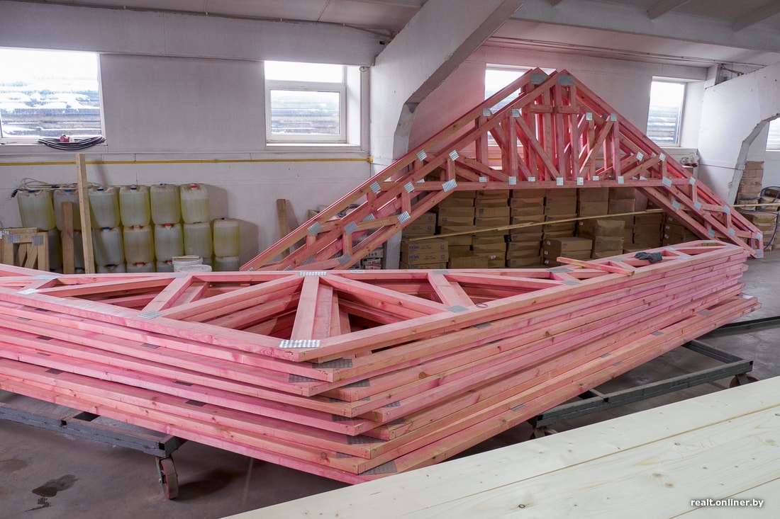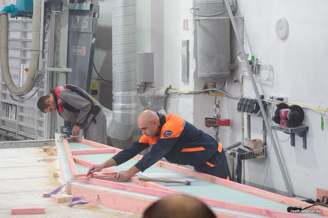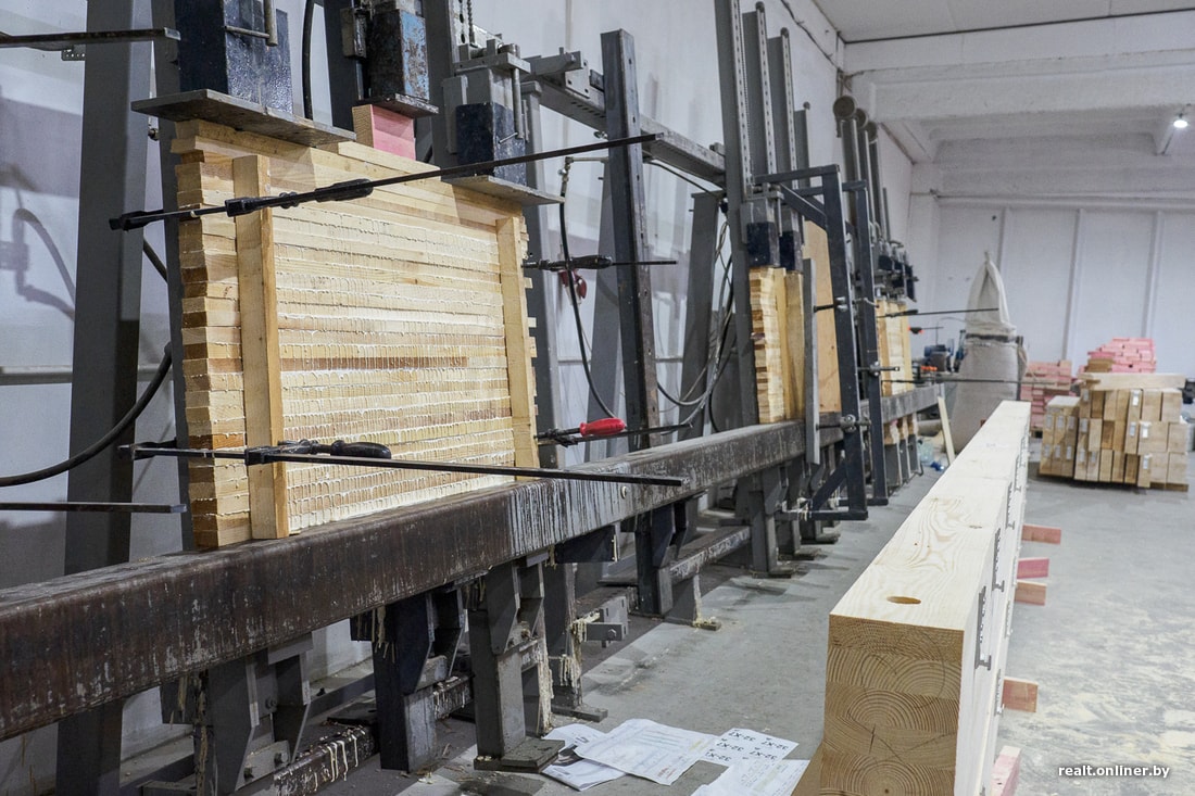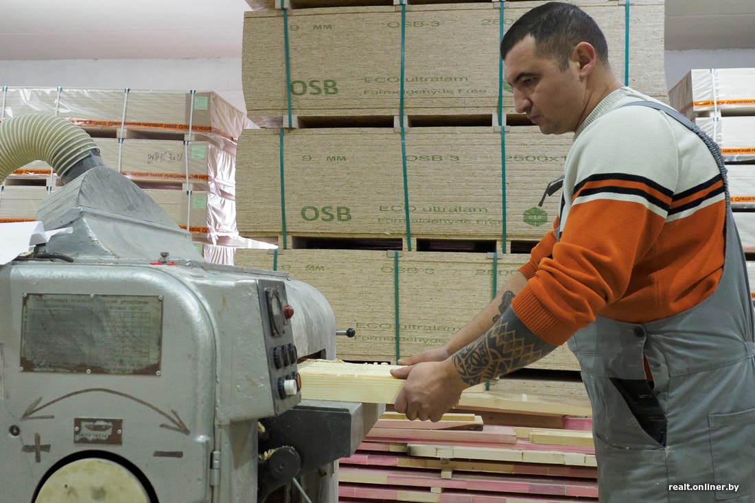 Производство каркасных домов в Ляховичах начинается с сырой необрезной доски, которую сушат в специальных камерах. Затем из нее строгают брус разной толщины, а из бруса создают конструкции дома. «Лишние» бруски и обрезки склеивают под прессом, чтобы создать клееный брус для вспомогательных конструкций (например, лестницы).