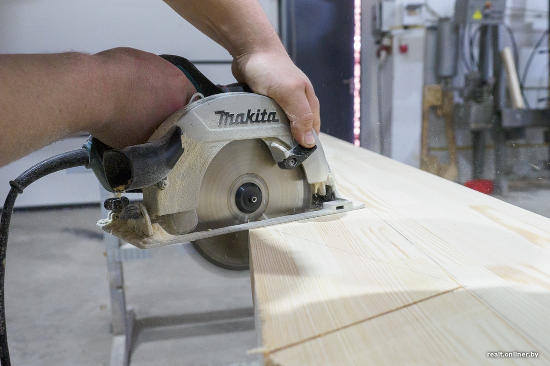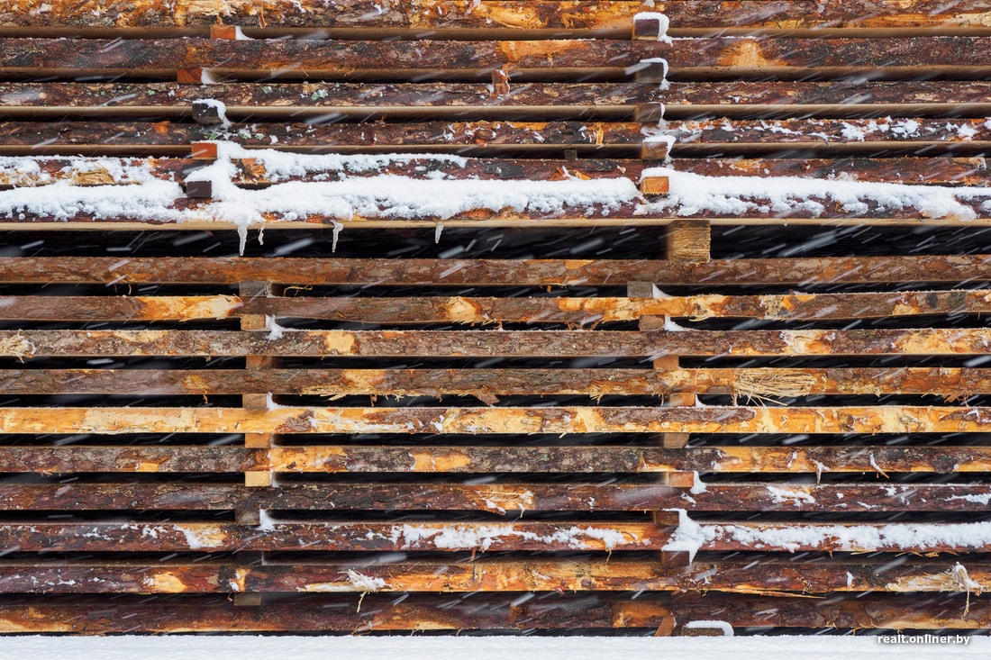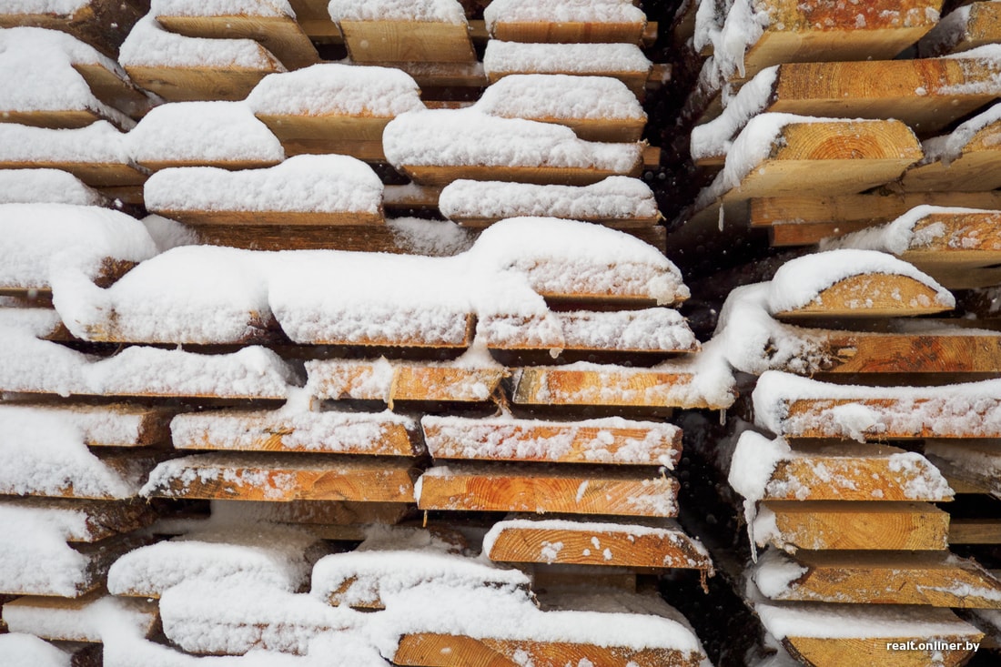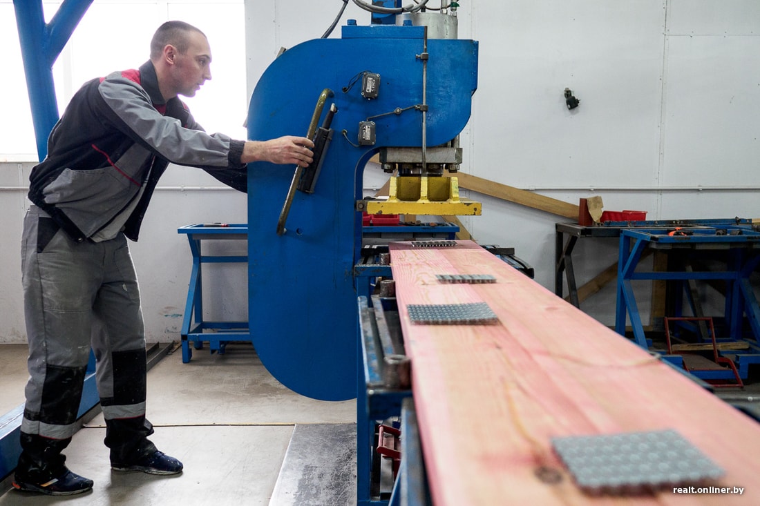 Производство каркасных домов в Ляховичах начинается с сырой необрезной доски, которую сушат в специальных камерах. Затем из нее строгают брус разной толщины, а из бруса создают конструкции дома. «Лишние» бруски и обрезки склеивают под прессом, чтобы создать клееный брус для вспомогательных конструкций (например, лестницы).