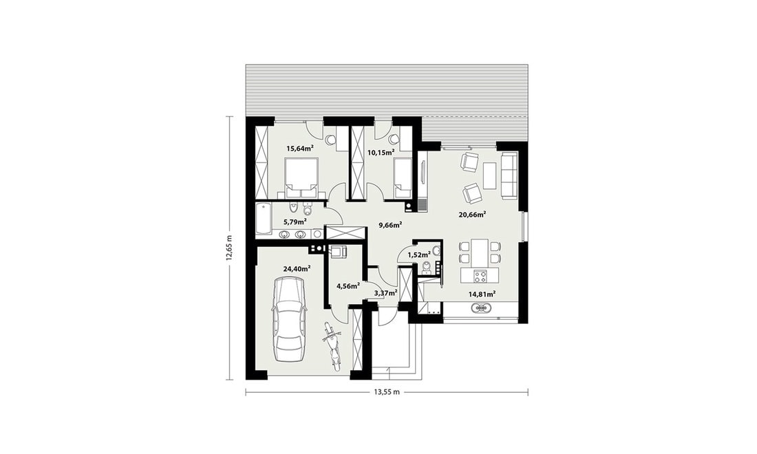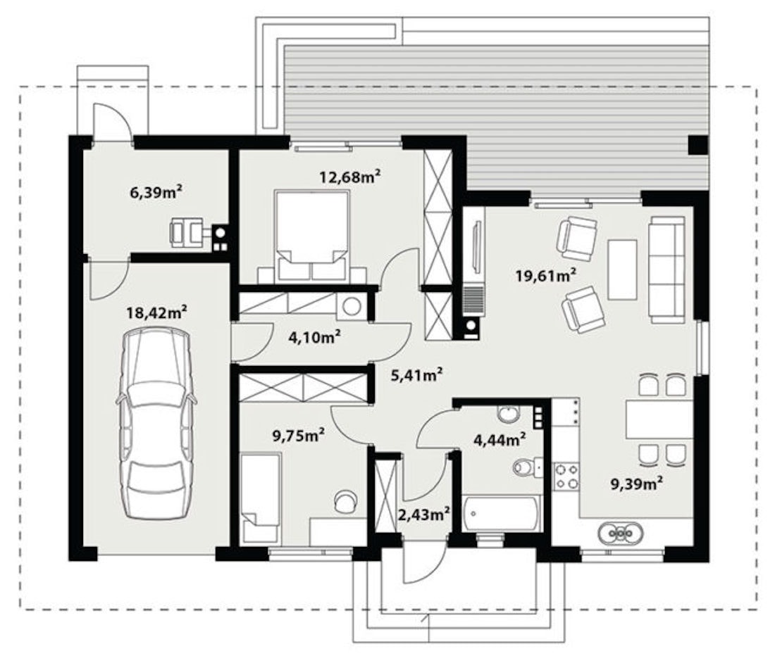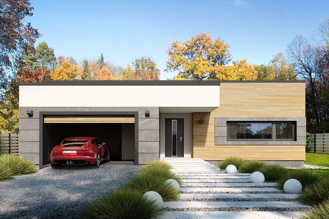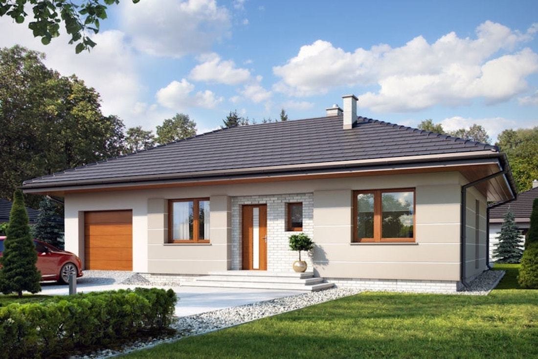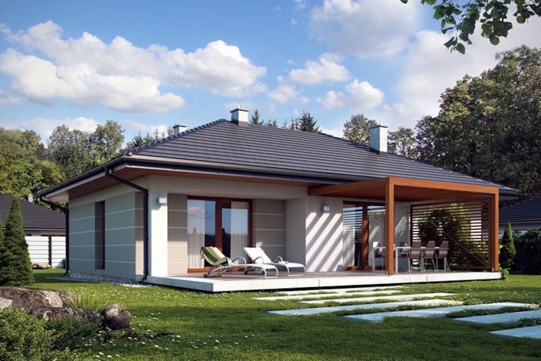 Проект по той же базовой цене (99 тыс. рублей), но в более современном стиле называется «Аквилон». В нем один этаж, три комнаты, 74,2 кв. м отапливаемой площади (140 кв. м — с учетом гаража и террасы).