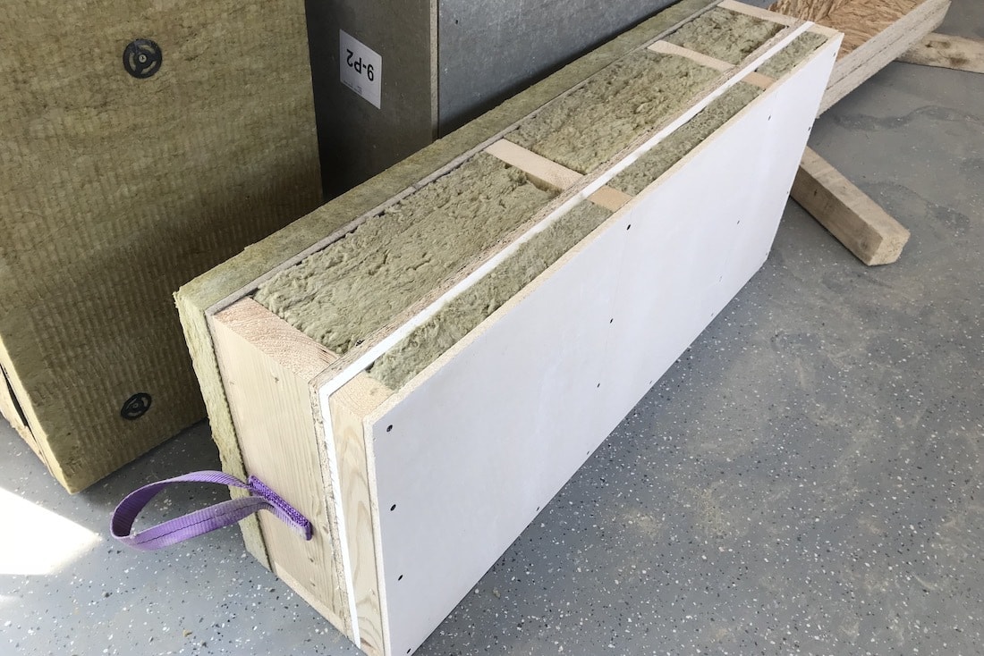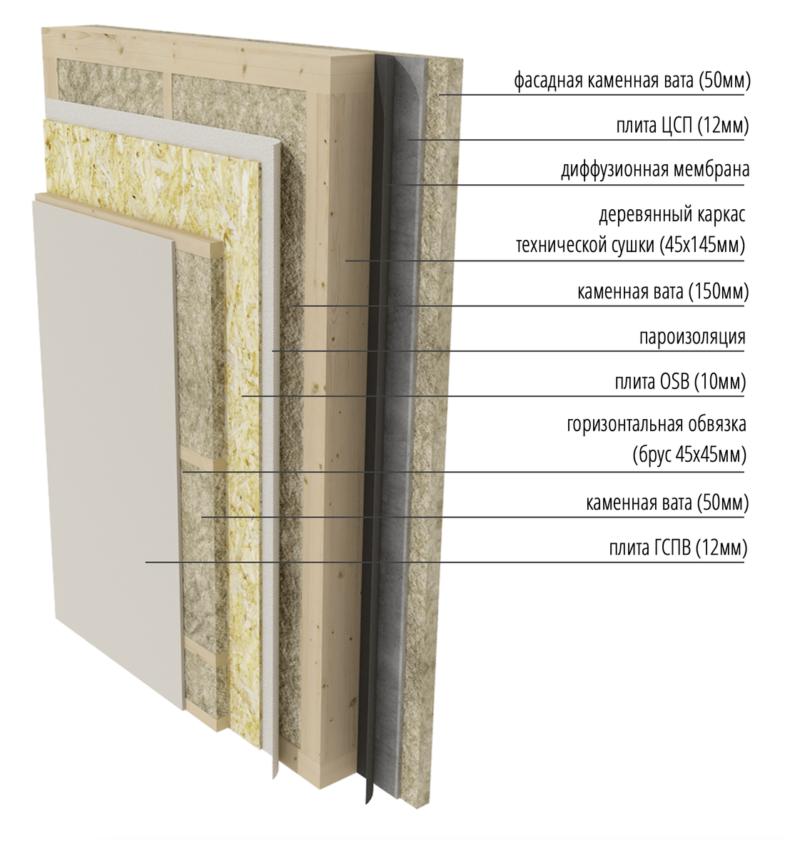 Из чего состоит стена дома? Изнутри идет гипсостружечная плита, затем — брусок 45 мм с утеплением 50 мм внутри. Этот слой перекрывает мостики холода, в него же закладываются все коммуникации. Затем идет OSB-плита толщиной 10 мм для жесткости каркаса, пароизоляция, каркас из бруса 145 мм со 150 мм утепления внутри, диффузионная мембрана, которая защищает от ветра, но пропускает пар изнутри панели. И завершает каркас цементно-стружечная плита, которая является основой для плотной фасадной ваты толщиной 50 мм. Для стены потоньше (в 200 мм) фасадная вата не используется.