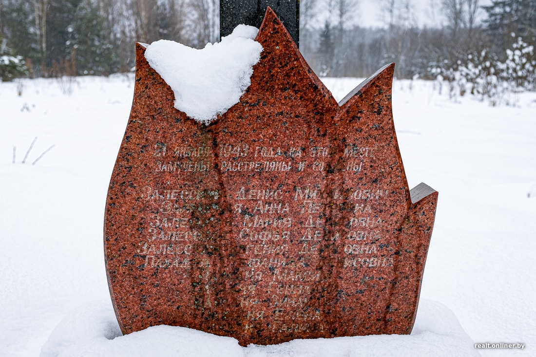 — Мой отец жил с женой и четырьмя детьми в конце деревни. Когда пришли немцы, он успел убежать в лес. Остальных расстреляли — отец это видел через открытое окно. Потом на этом месте поставили кресты. После войны отец вернулся, завел новую семью… Когда я училась в третьем классе, мы раскопали останки и перезахоронили их на кладбище в соседней Гутнице, — говорит женщина.